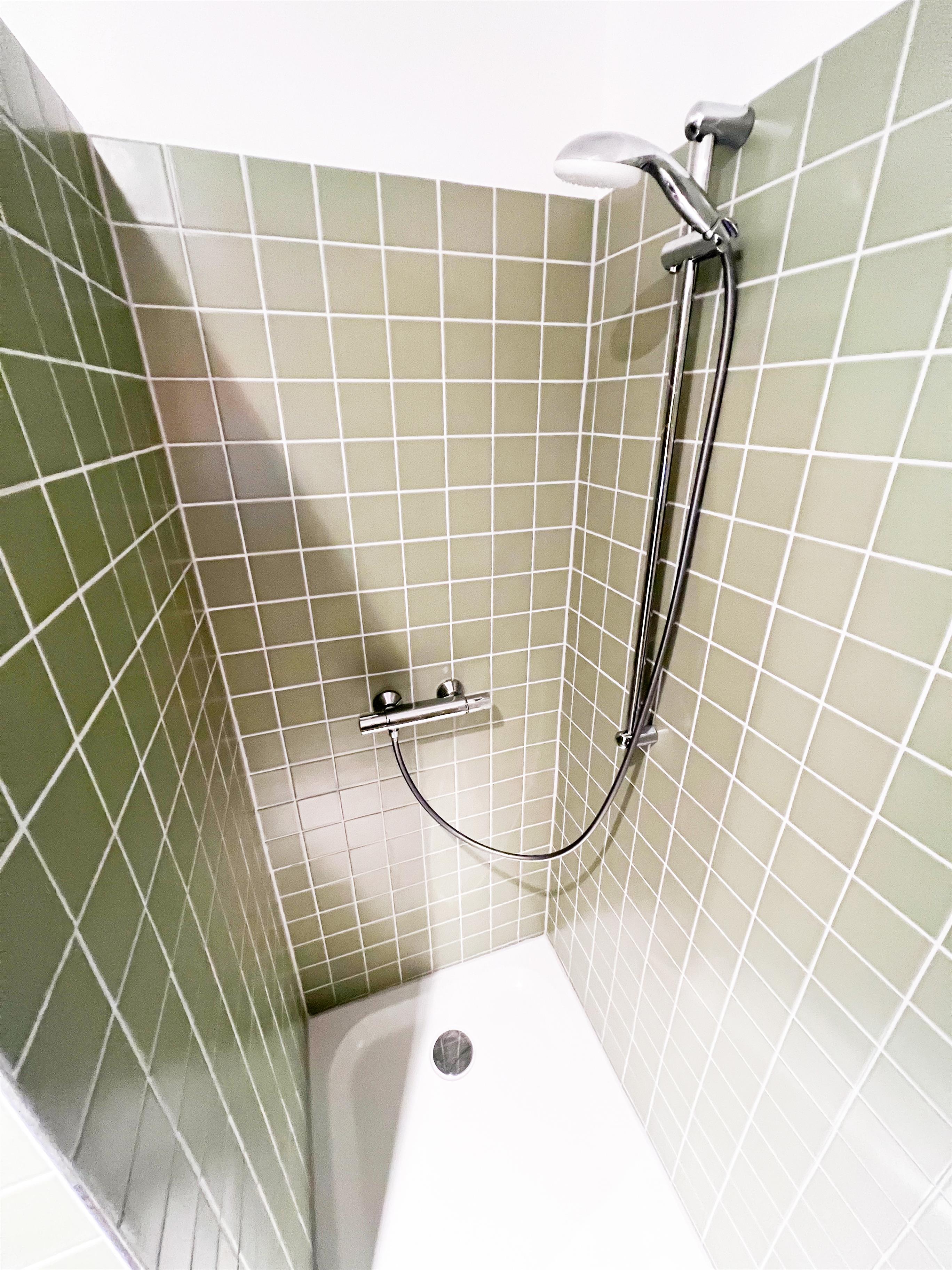 Das innen liegende Badezimmer passt sich dem modernen Look der Wohnung an und ist gut ausgestattet.