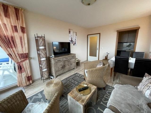 Auf ca. 42 m² bietet diese Ferienwohnung ein helles freundliches Wohnzimmer mit Sofa , Esstisch, TV und Balkon mit Meerblick.