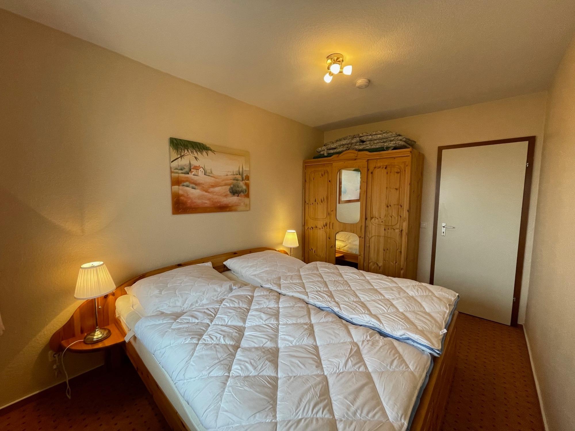 Das Schlafzimmer verfügt über ein komfortables Ehebett & Kleiderschrank und ist mit Außenrollladen abdunkelbar, hier ist leider kein Platz für ein Kinderreisebett.
