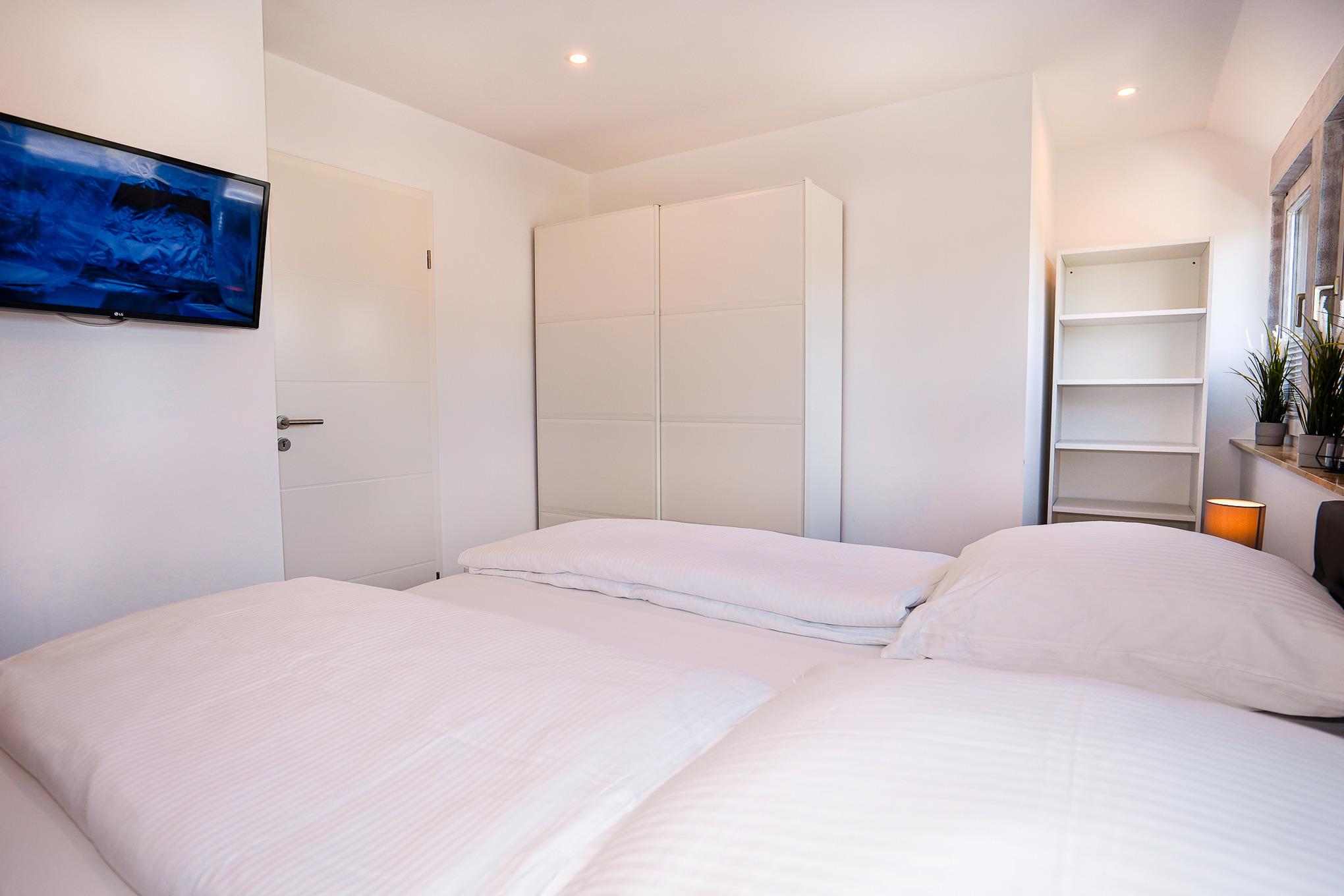 Das erste Schlafzimmer verfügt über ein großes Boxspringbett (200x200). Die hochwertigen Matratzen lassen sich einzeln und elektrisch verstellen. Ein Kleiderschrank, Nachttische und ein eigener Fernseher ergänzen die Ausstattung.
