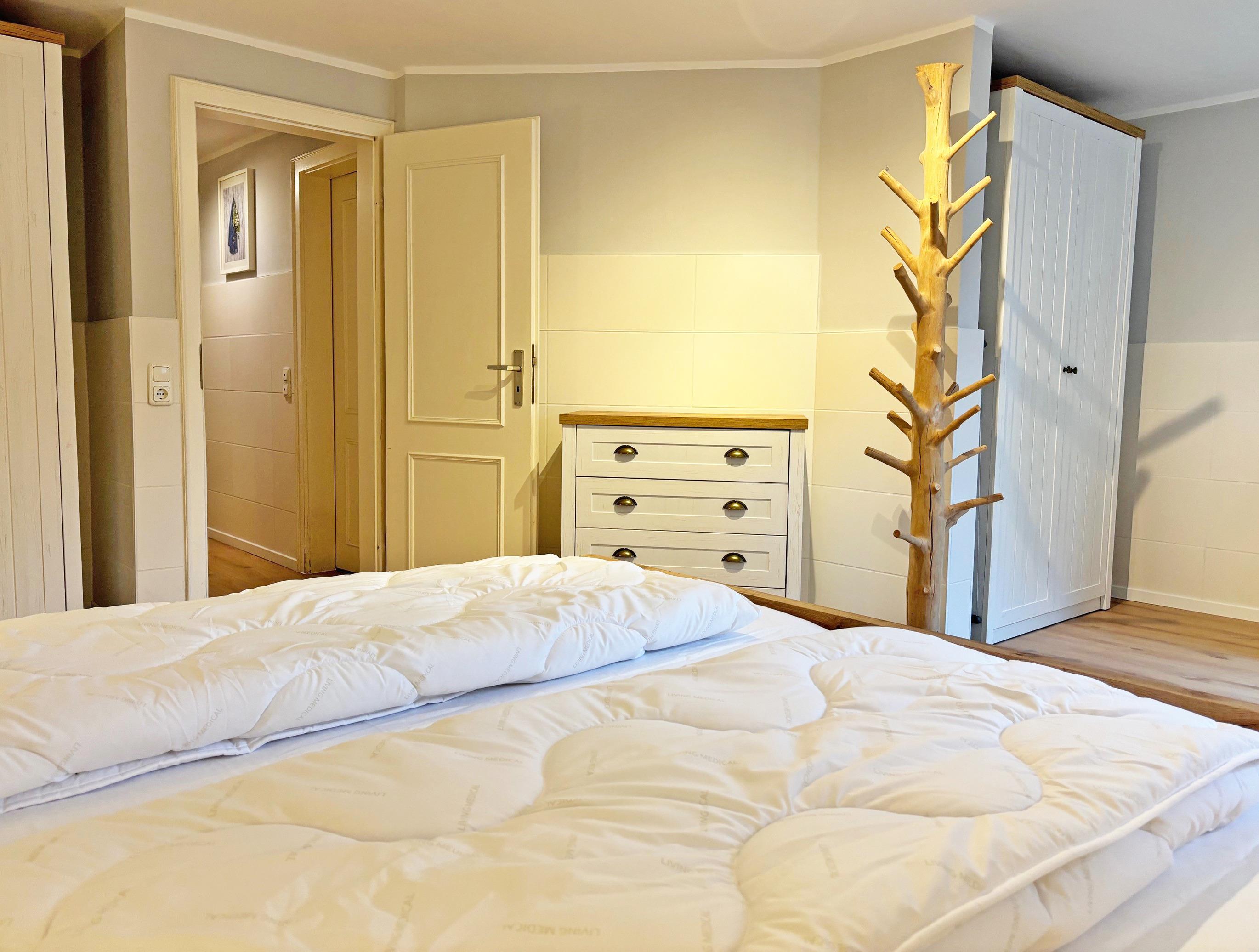 Im Souterrain befinden sich die beiden Schlafzimmer. Diese sind gefliest. Das größere Schlafzimmer ist mit einem Doppelbett (2x 90x200cm), 2 Nachttischen und zwei Kleiderschränken ausgestattet. Das Fenster ist mit einem Plissee und Vorhängen ausgestattet und lässt sich verdunkeln.