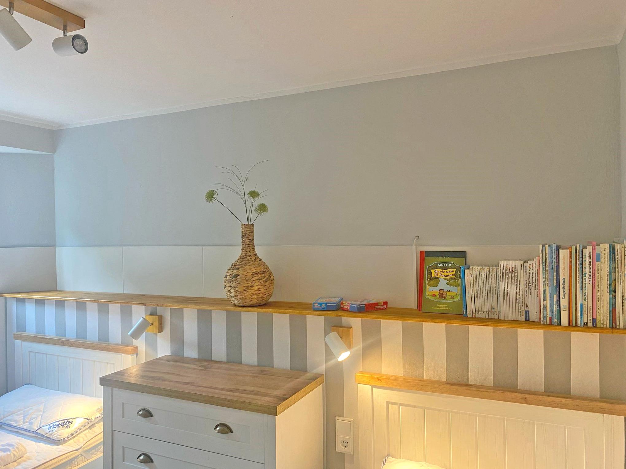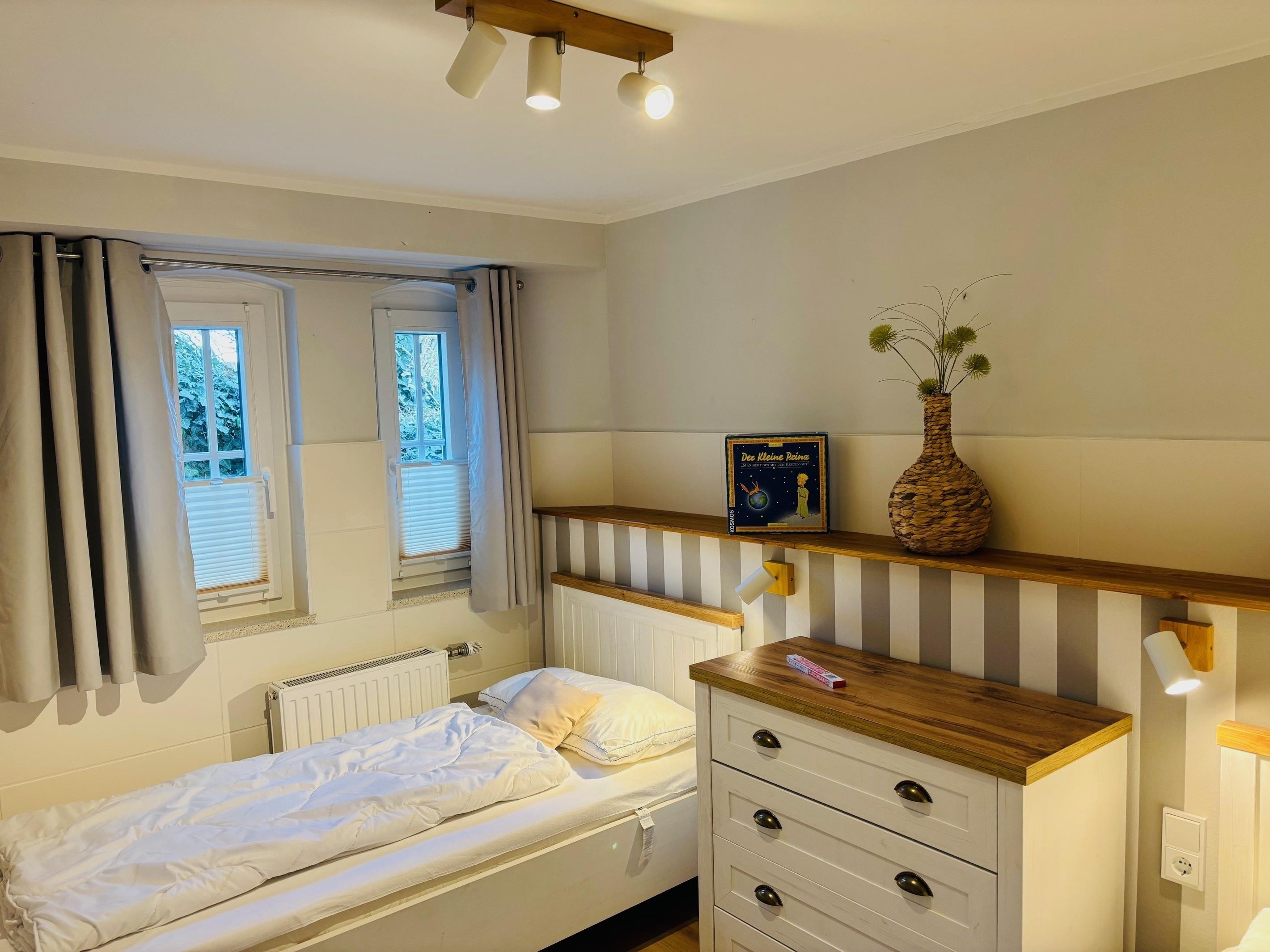 In dem kleineren Schlafzimmer stehen zwei Einzelbetten (jeweils 90x200cm). Das Zimmer ist gefliest, das Fenster lässt sich durch ein Plissee und Vodrhänge verdunkeln.