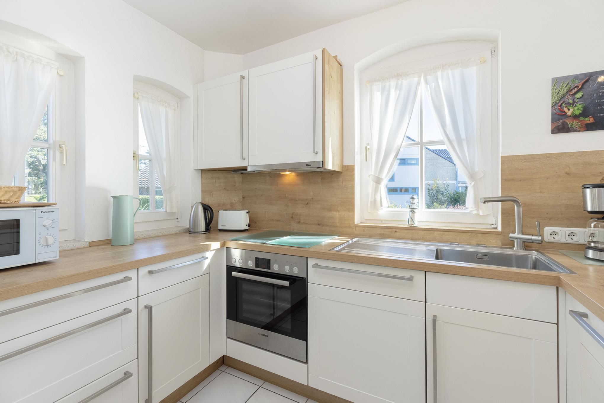 Die angrenzende, offene Küche ist komplett ausgestattet mit einem Ceran-Kochfeld, Backofen, Spülmaschine, Kühlschrank mit kleinem 3-Sterne Gefrierfach, Wasserkocher, Toaster und Kaffeemaschine.