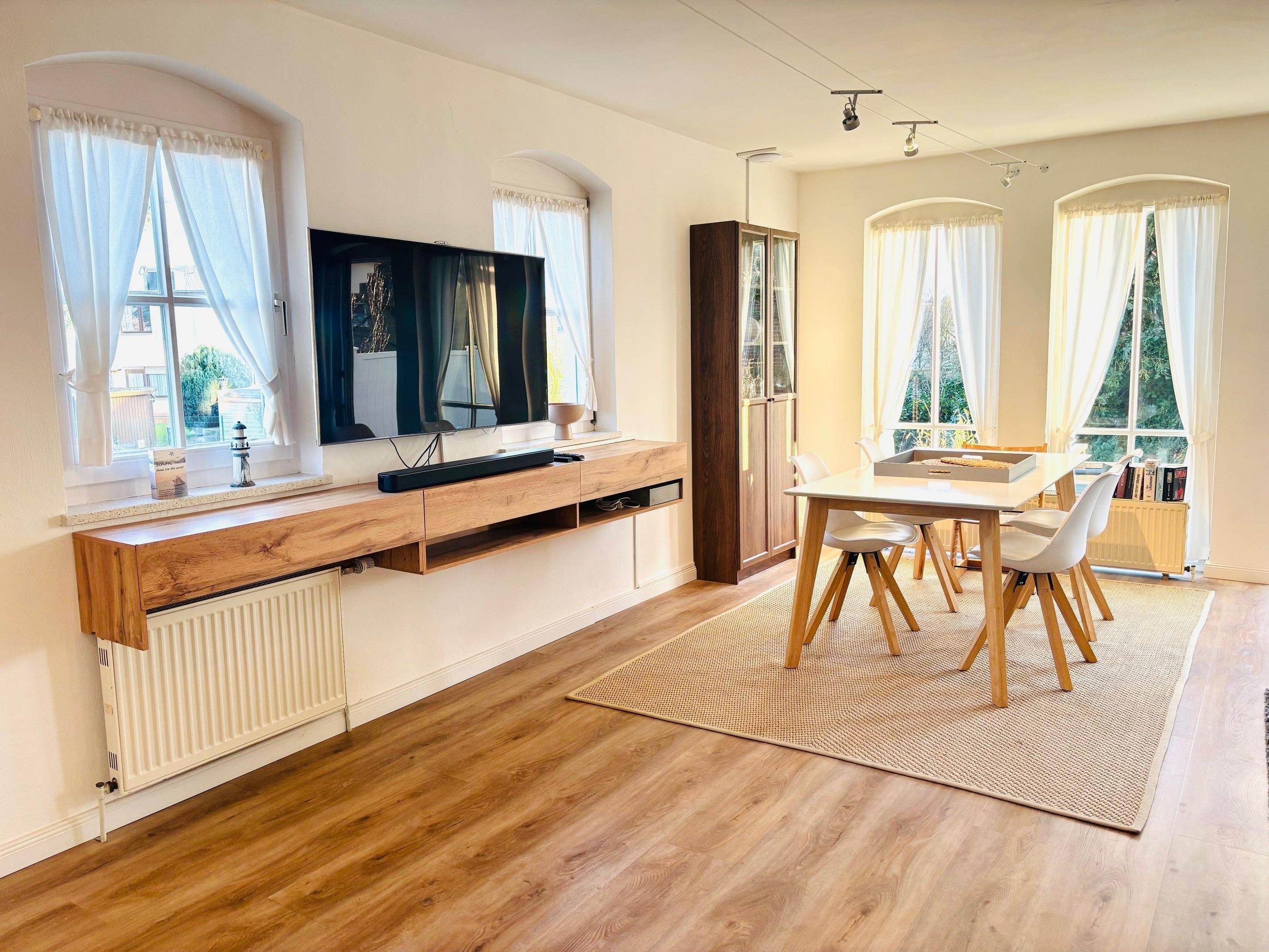 Die Wohnung bietet Ihnen ein modern ausgestattetes Wohn- und Esszimmer mit direktem Zugang zur Terrasse mit Süd-West-Ausrichtung. Das Wohn- und Esszimmer ist mit einem Sofa, einem Couchtisch, einem Essplatz für 4 Personen und einem Wohnzimmerschrank ausgestattet. Hier steht Ihnen ein Flachbildschirm TV und eine Soundbar zur Verfügung.