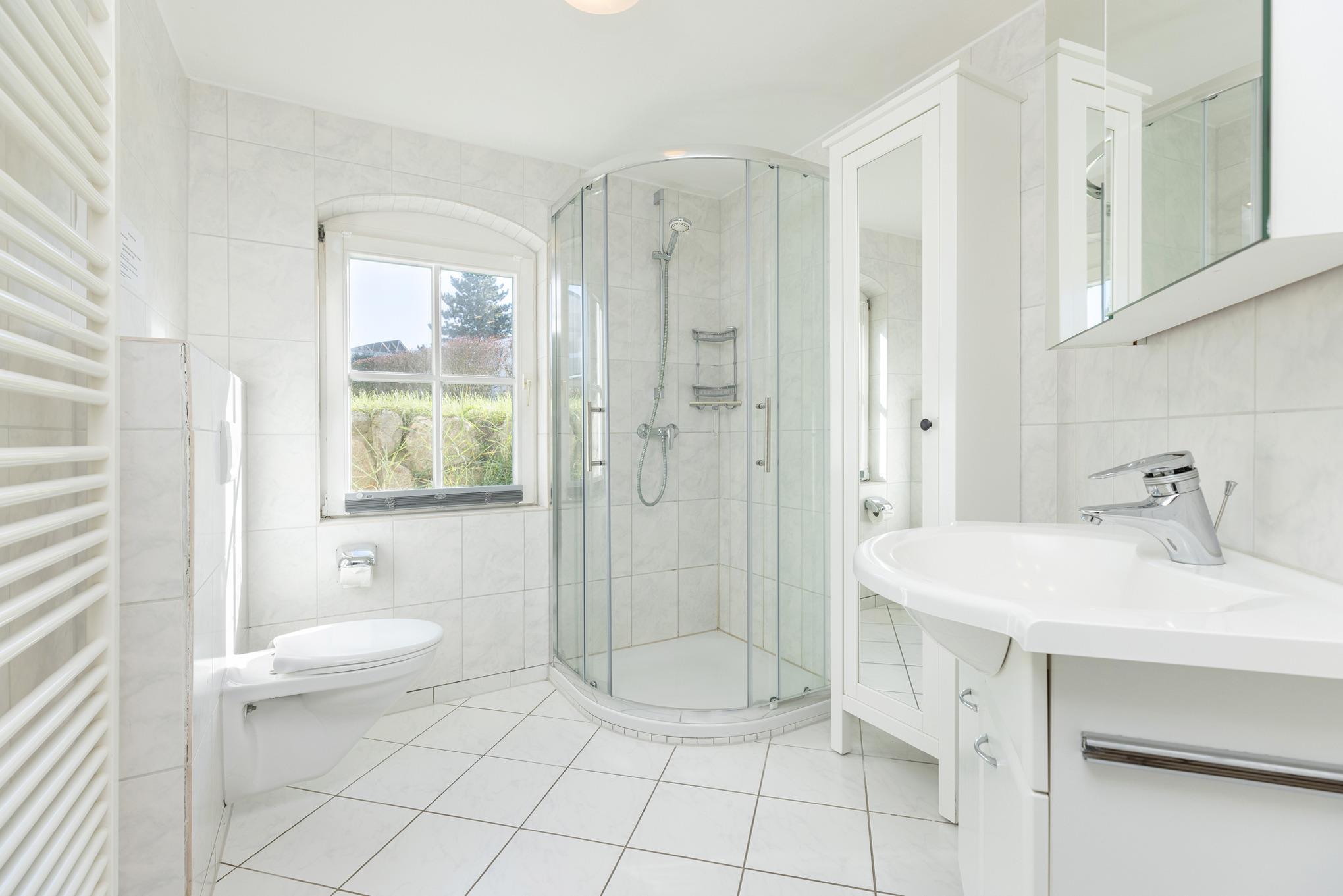 Das großzügige Tageslicht-Bad mit Dusche, WC, Waschbecken und Waschmaschine befindet sich ebenfalls im Souterrainbereich.