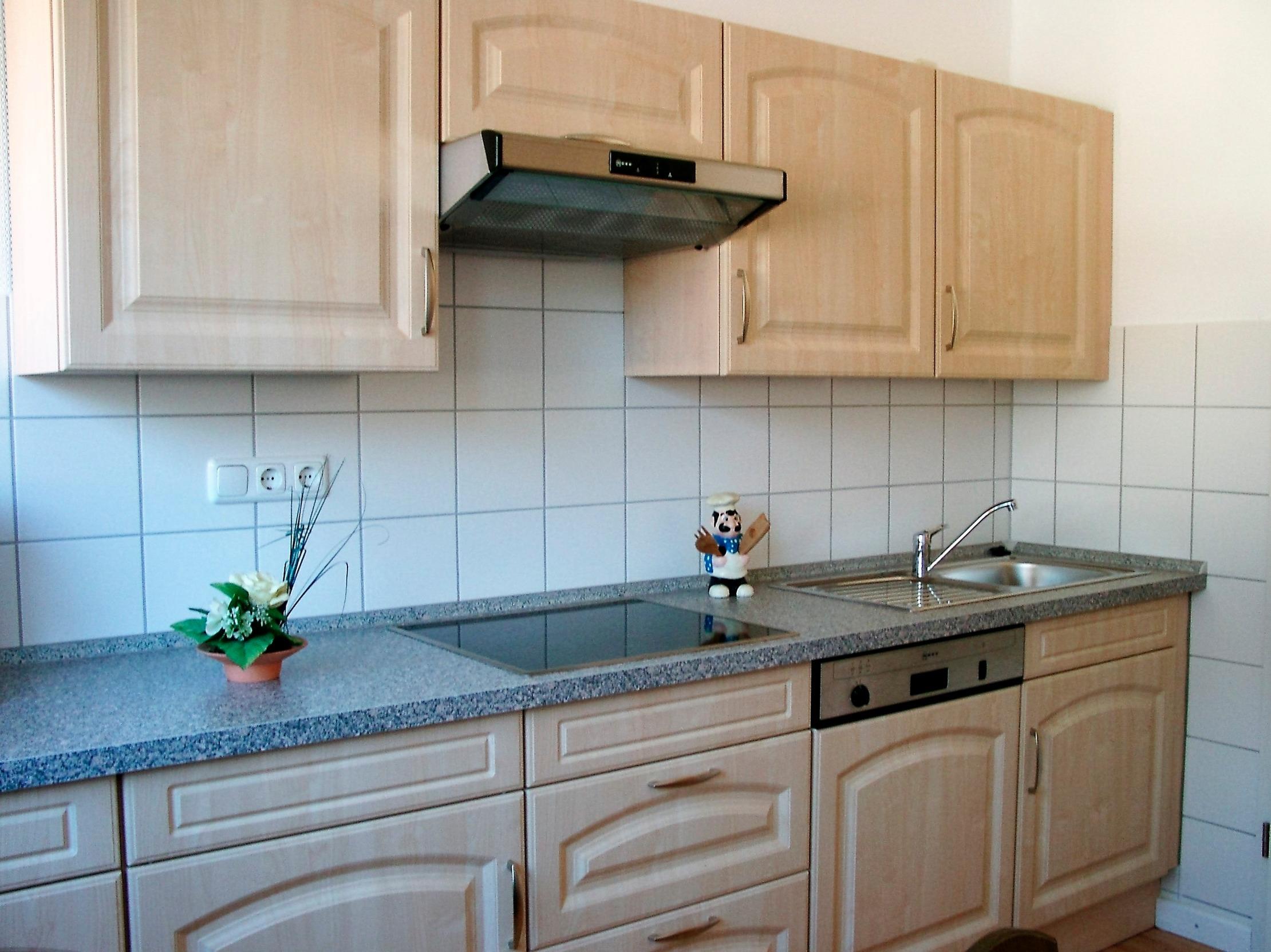Die separate, moderne Wohnküche ist mit einem vier Platten Ceran-Kochfeld, Kühlschrank, Gefrierfach, Geschirrspülmaschine, Mikrowelle, Kaffeemaschine, Toaster und Wasserkocher ausgestattet. Geschirr, Töpfe, Pfannen und Gläser gehören auch dazu. Ein Esstisch mit vier Stühlen steht zur Verfügung.