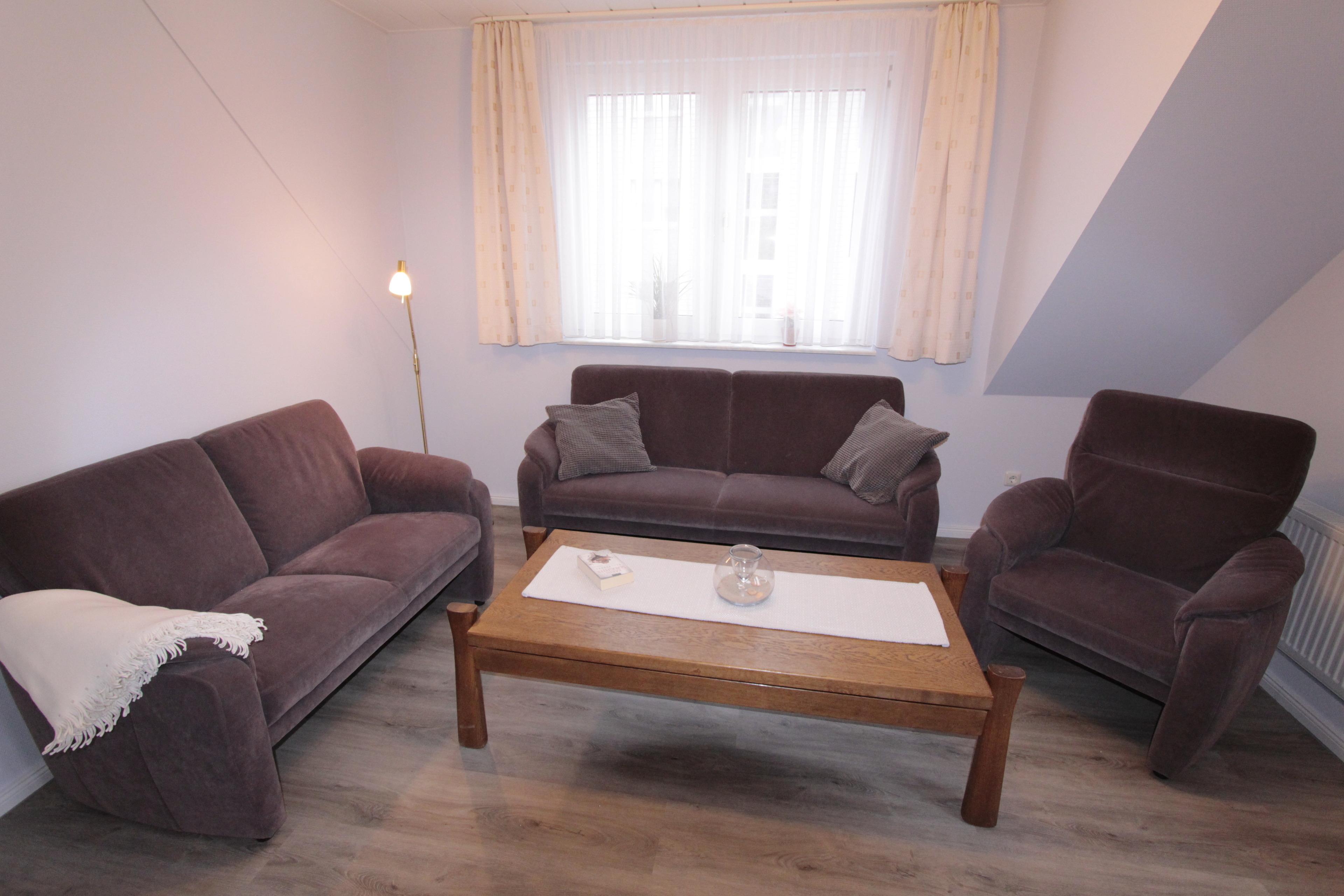 Im großen Wohnzimmer steht ein Sofa mit Sessel und ein Beistelltisch sowie ein 32 Zoll großer HD Fernseher, zudem ein Radio CD Player und WLAN.