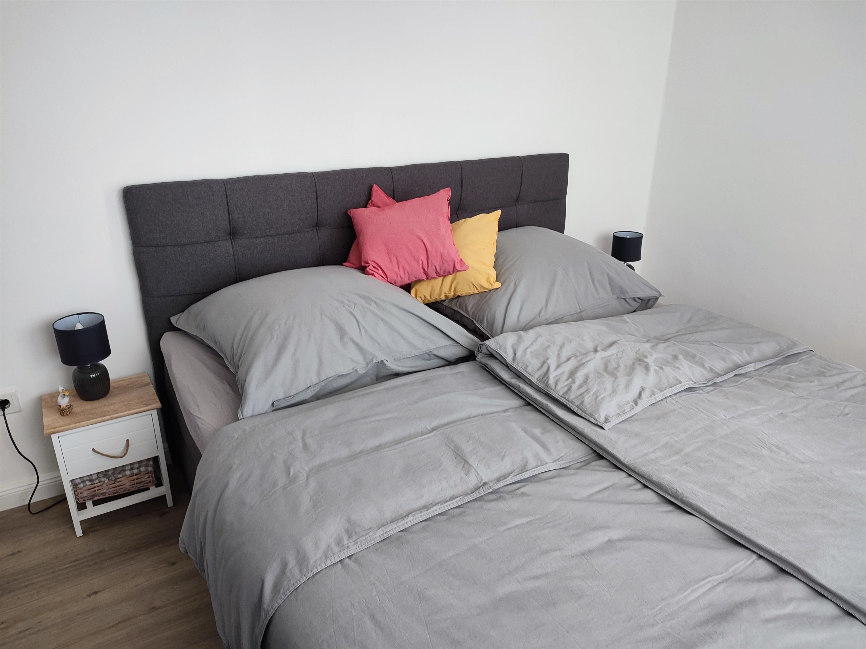 Komfortables Schlafzimmer: Unsere Ferienwohnung verfügt über ein Schlafzimmer mit einem bequemen Boxspringbett (1,80 x 2 m), in dem Sie eine erholsame Nachtruhe genießen können. Der perfekte Ort, um neue Energie für aufregende Tage zu tanken.