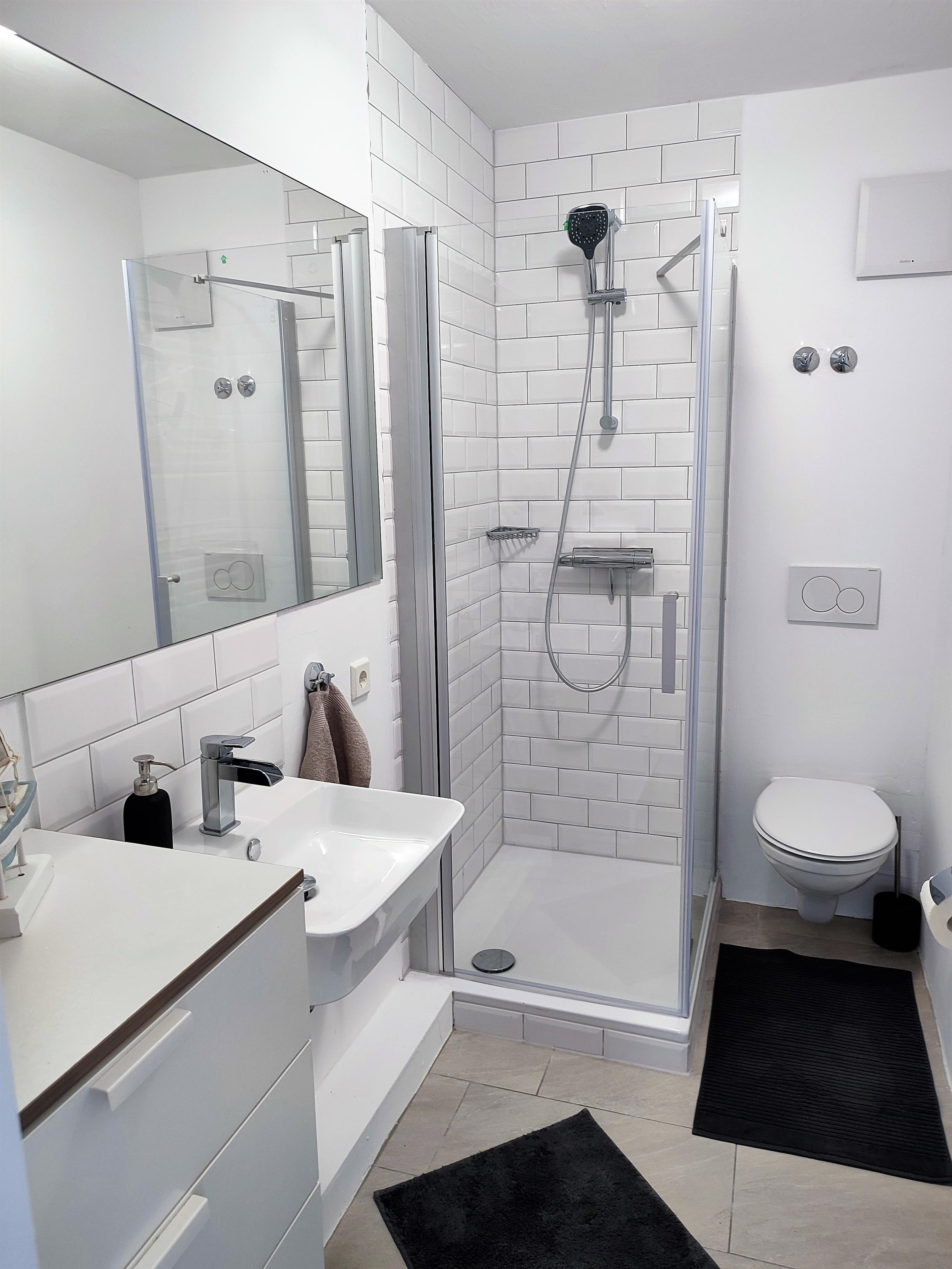 Modernes Badezimmer: Frisch und zeitgemäß eingerichtet, bietet unser Badezimmer alles, was Sie für einen angenehmen Aufenthalt benötigen.