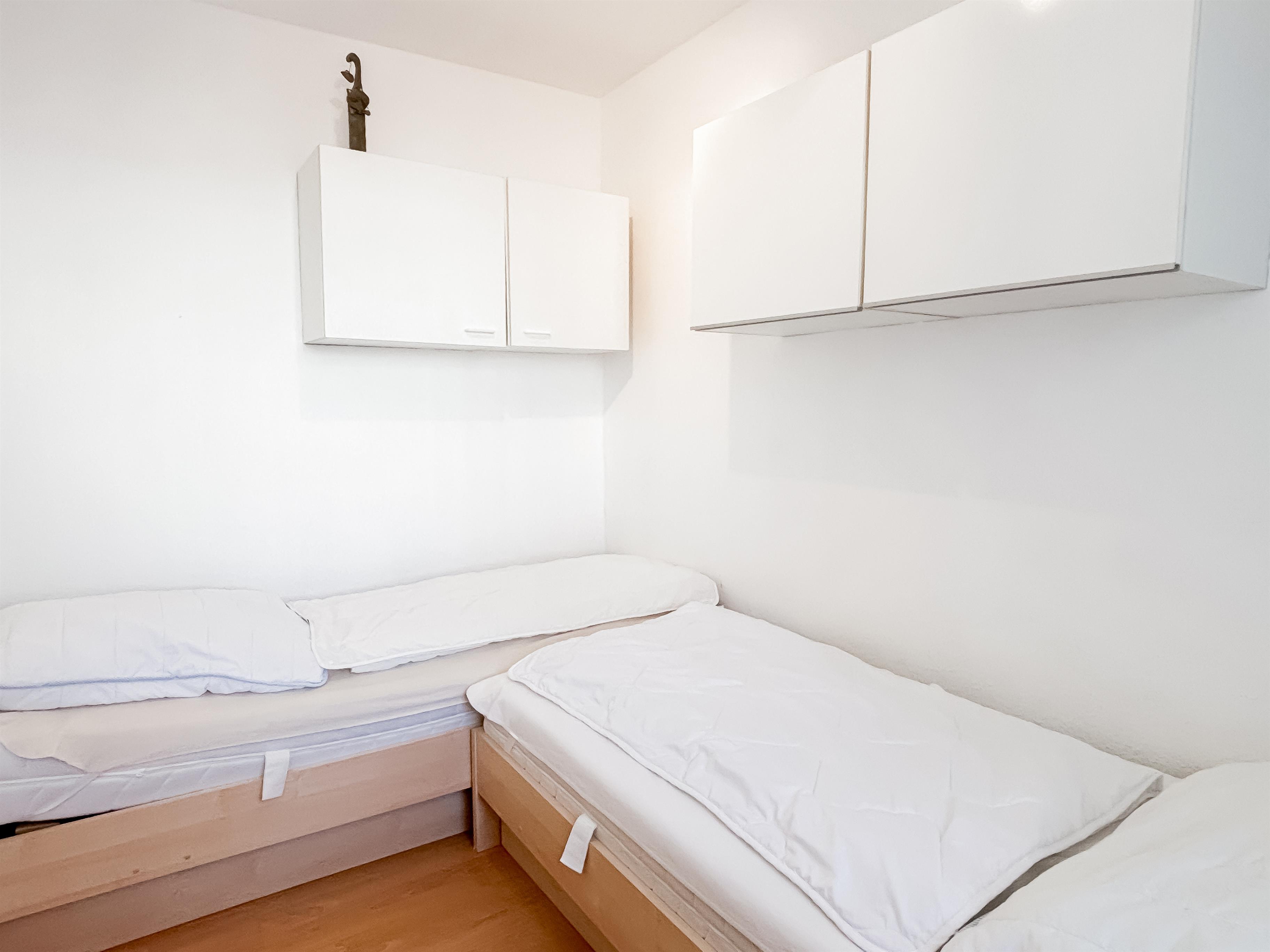Im 2. Zimmer stehen 2 Einzelbetten . Das Duschbad ist hell und freundlich.