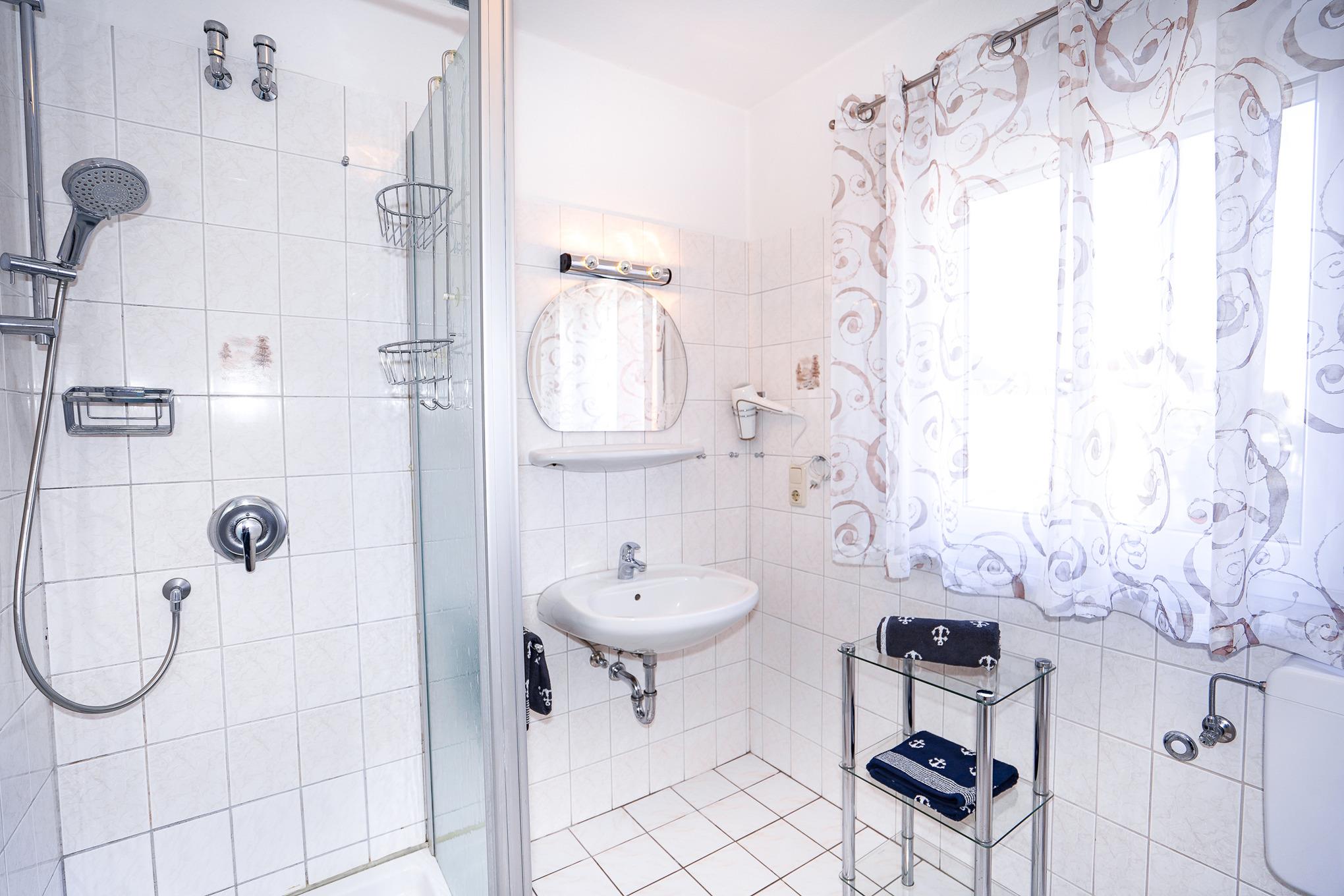 Das Tageslichtbadezimmer ist mit einer Eckdusche ausgestattet.