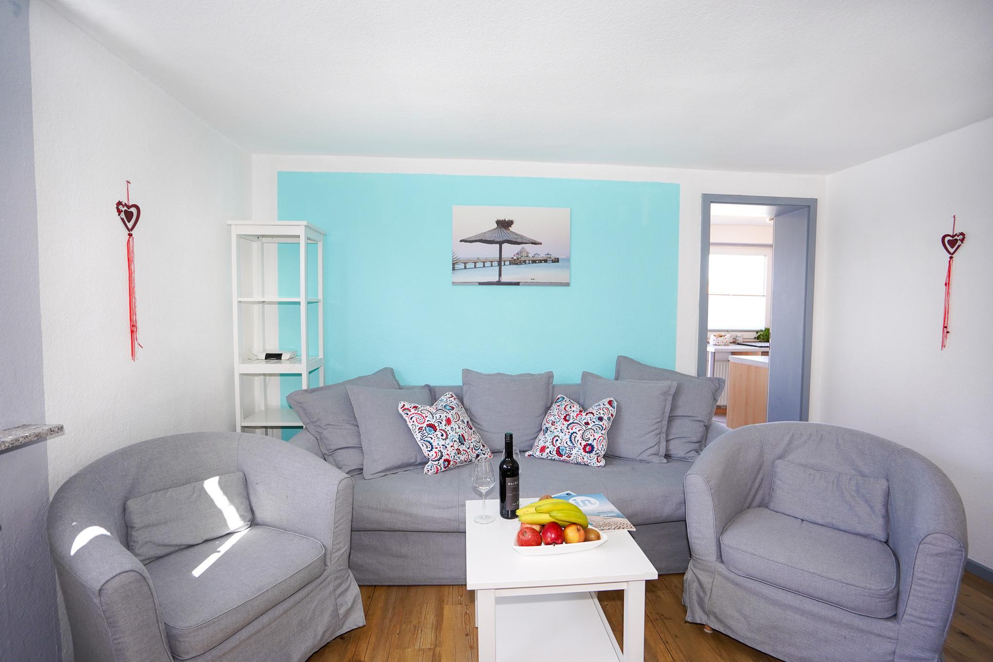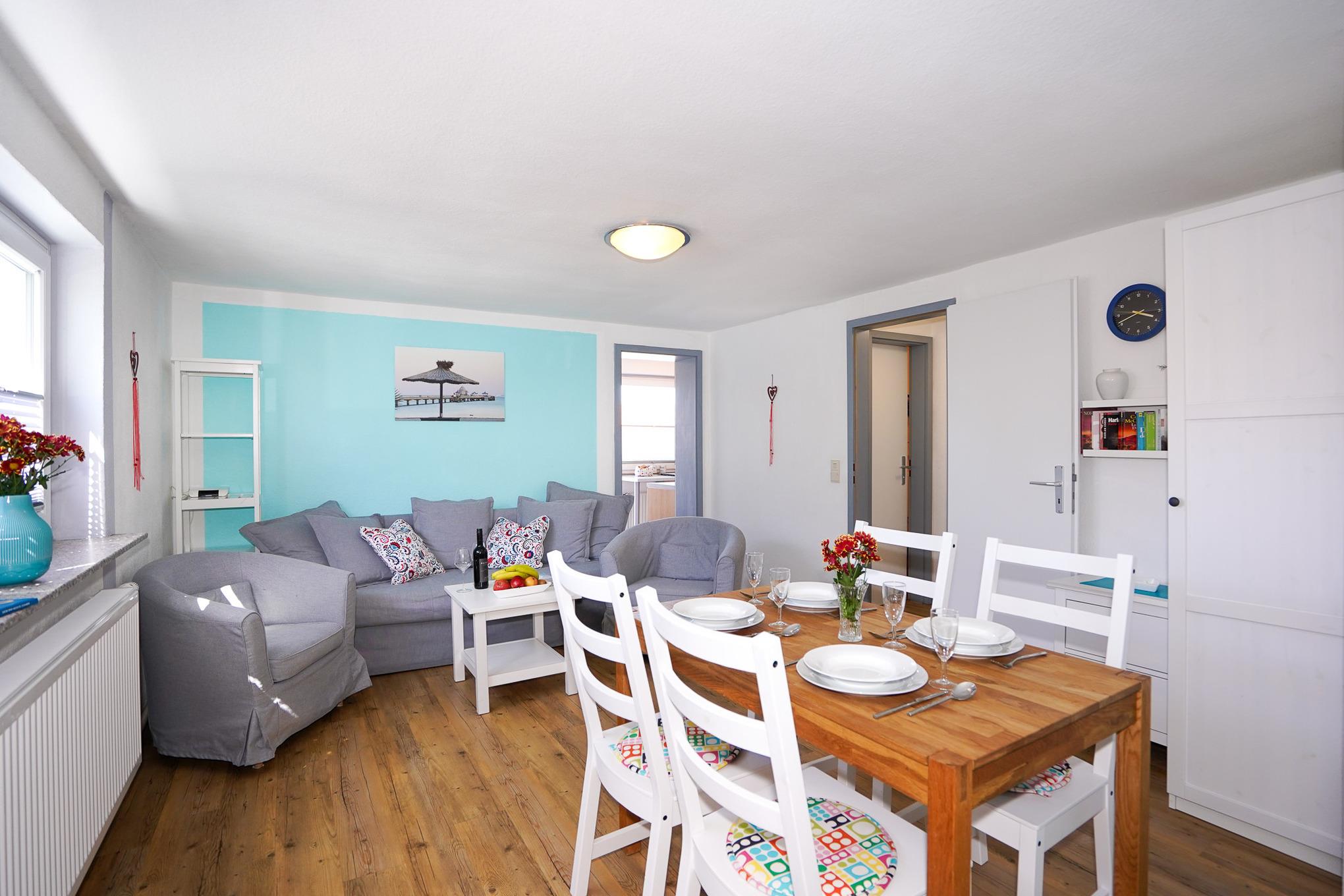 Die modern ausgestattete Nichtraucherwohnung mit einer Größe von ca. 48 qm ist für bis zu 4 Personen eingerichtet. Im Wohnzimmer mit SAT-TV befinden sich eine Couch, zwei bequeme Sessel sowie ein Esstisch mit Stühlen. In der Küche finden Sie neben einem 4-Platten Kochfeld mit Backofen und den üblichen Elektrogeräten auch eine Spülmaschine und eine Mikrowelle vor. Neben einem Schlafzimmer mit Doppelbett und Kleiderschrank, sowie einem kleinen Schlafzimmer mit einem Etagenbett, steht Ihnen ein Duschbad mit WC zur Verfügung.