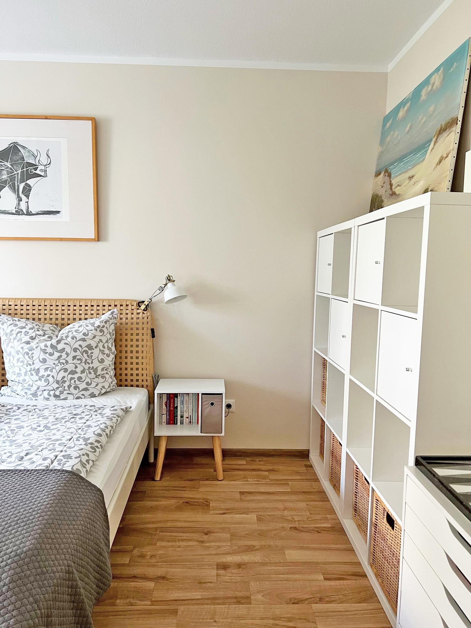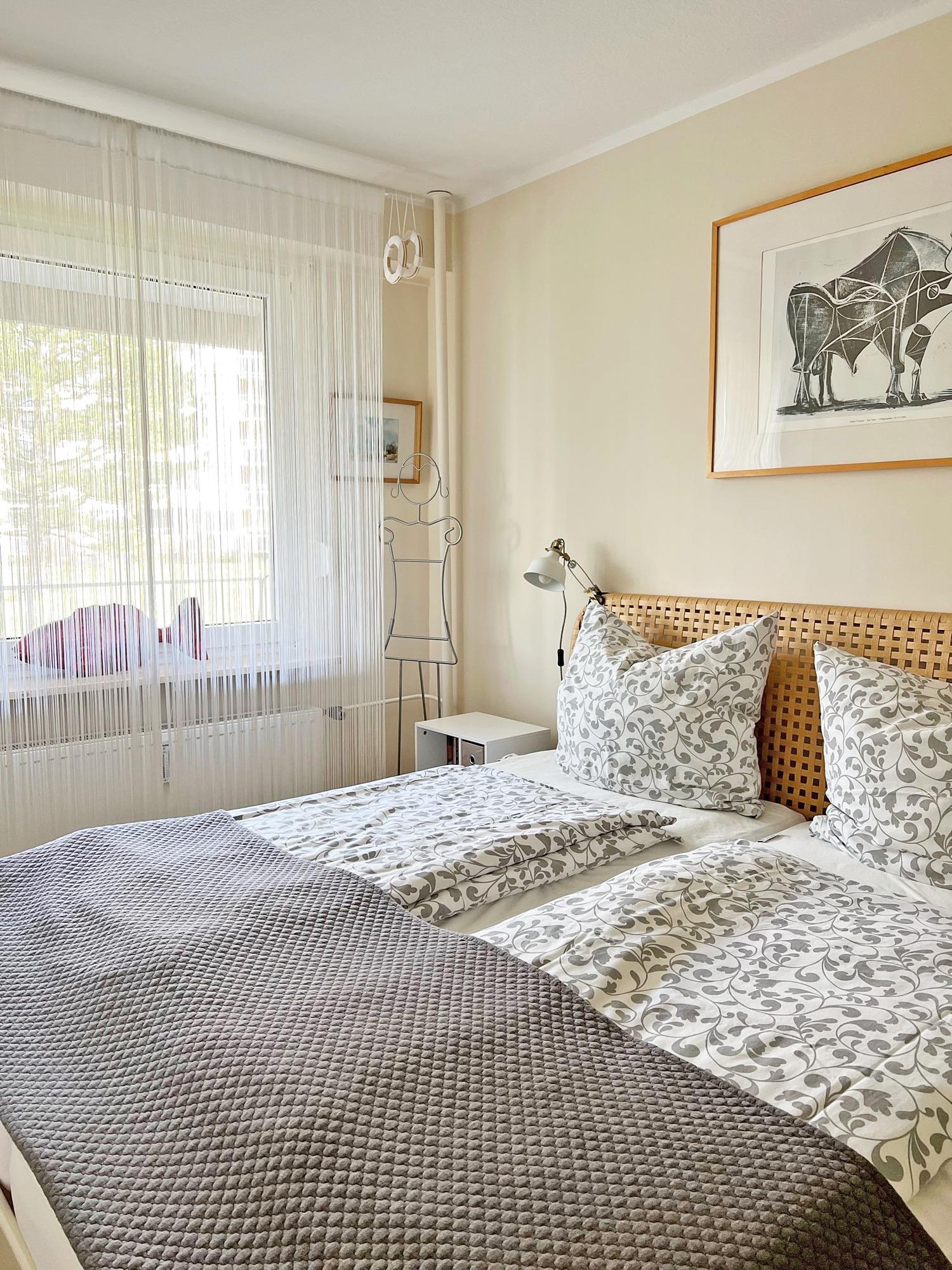 Das Schlafzimmer ist hell und freundlich, das Fenster lässt sich verdunkeln. Das Doppelbett (180x200) hat ein offenes Fußende. Für Ihre Urlaubsgarderobe nutzen Sie die offenen Schränke und den großen Einbauschrank im Flurbereich.