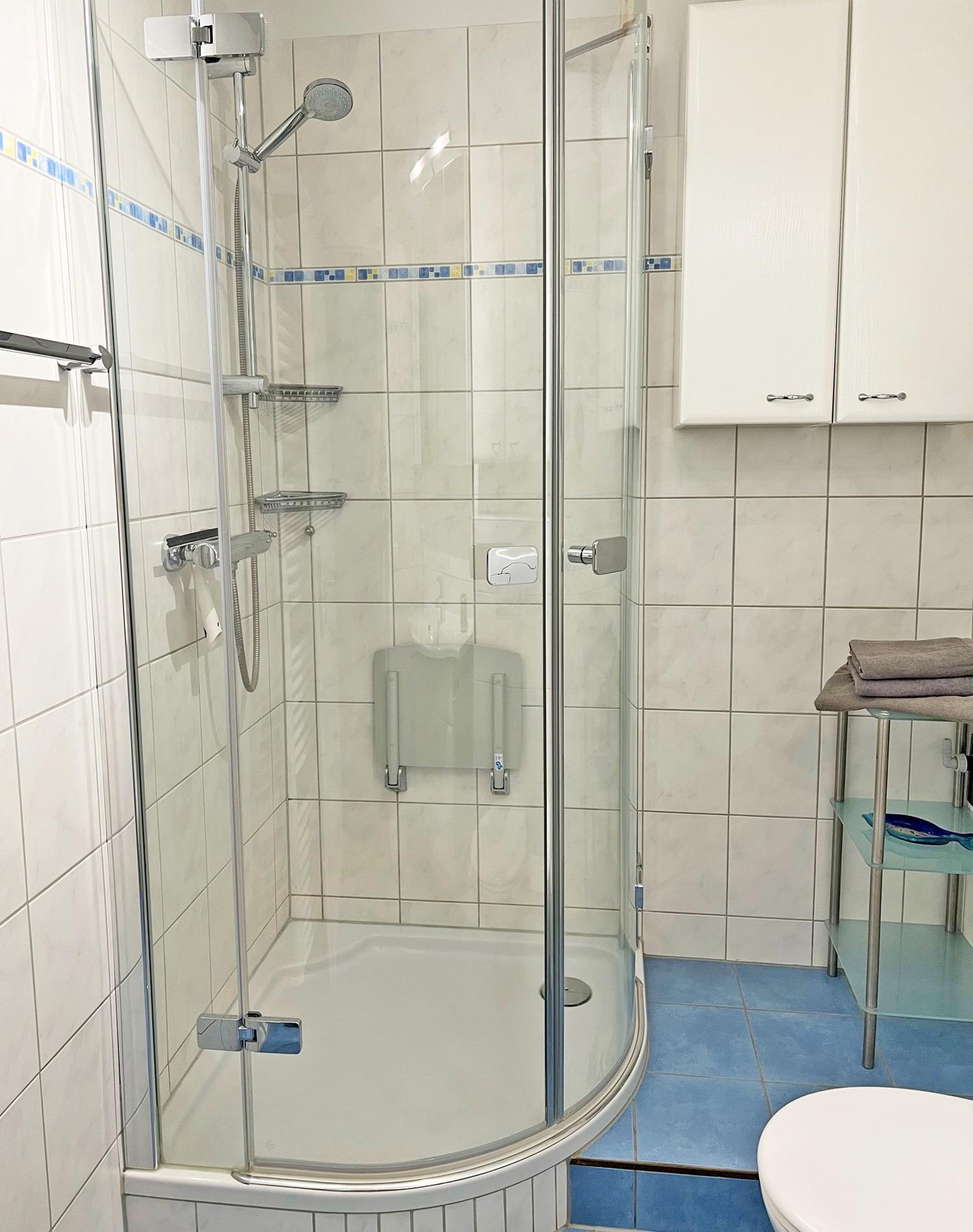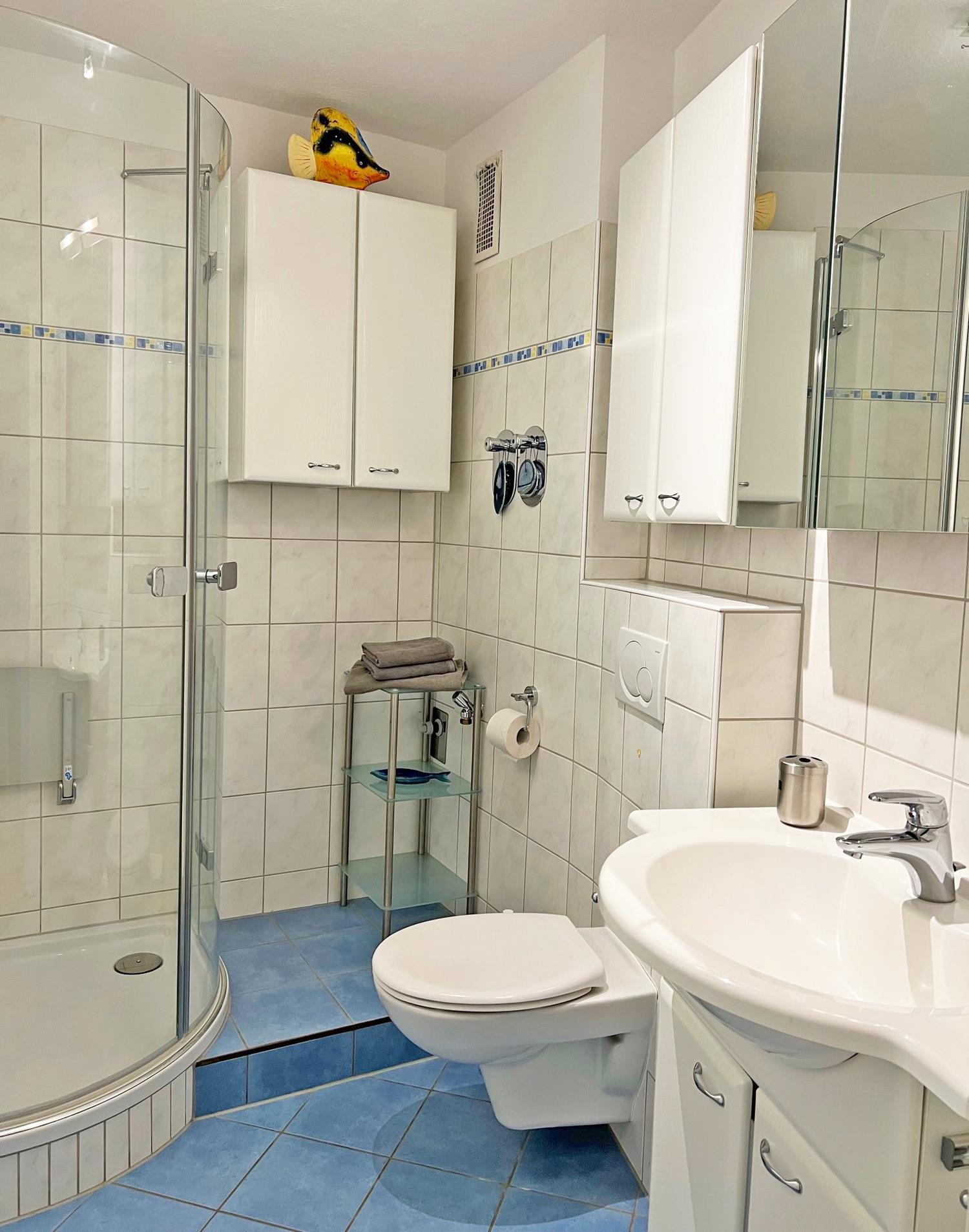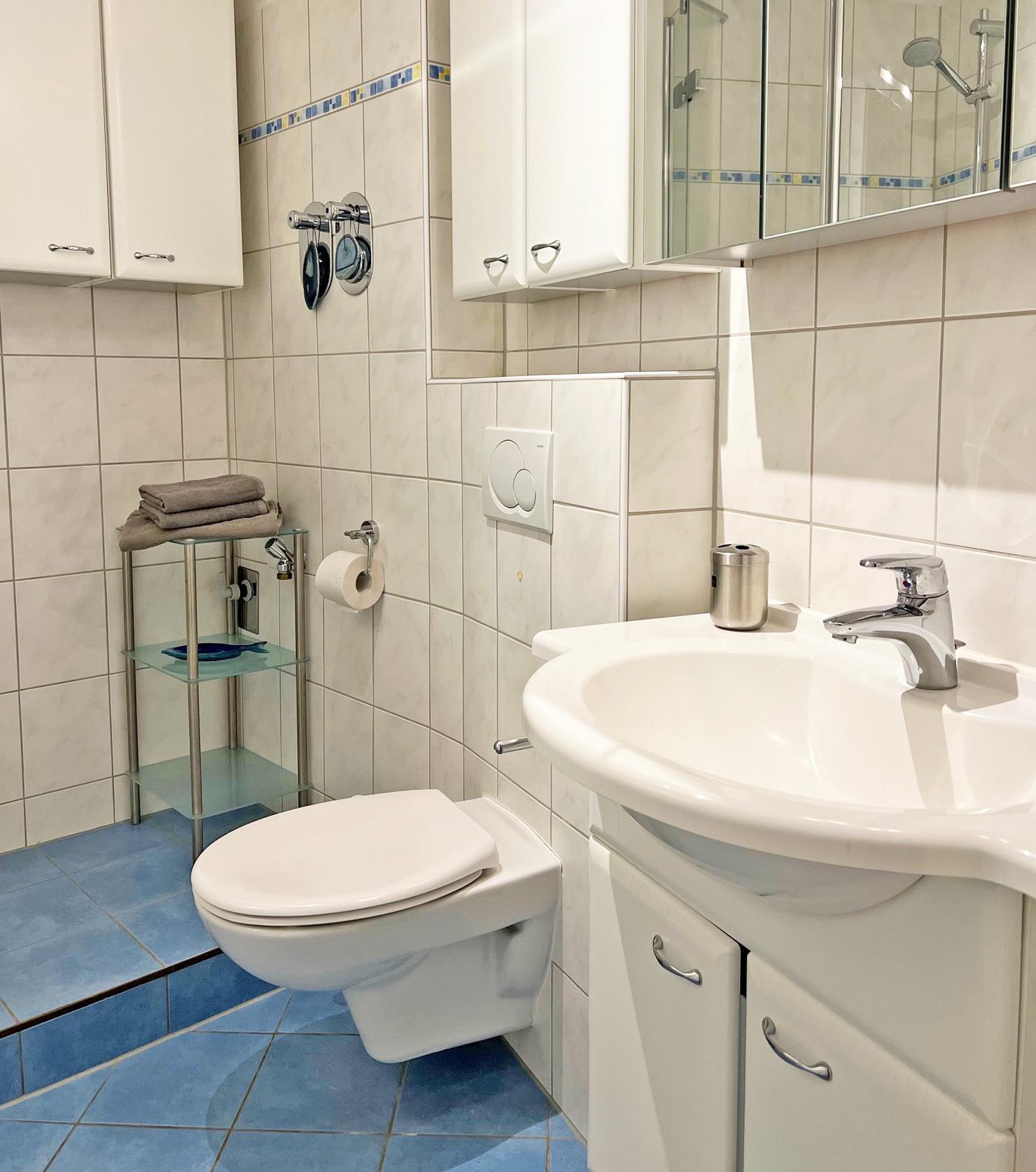 Neben einem Waschbecken, Handtuchheizkörper und WC steht Ihnen im Bad eine Dusche zur Verfügung. Mehrere Schränke bieten Platz für Kosmetikutensilien.