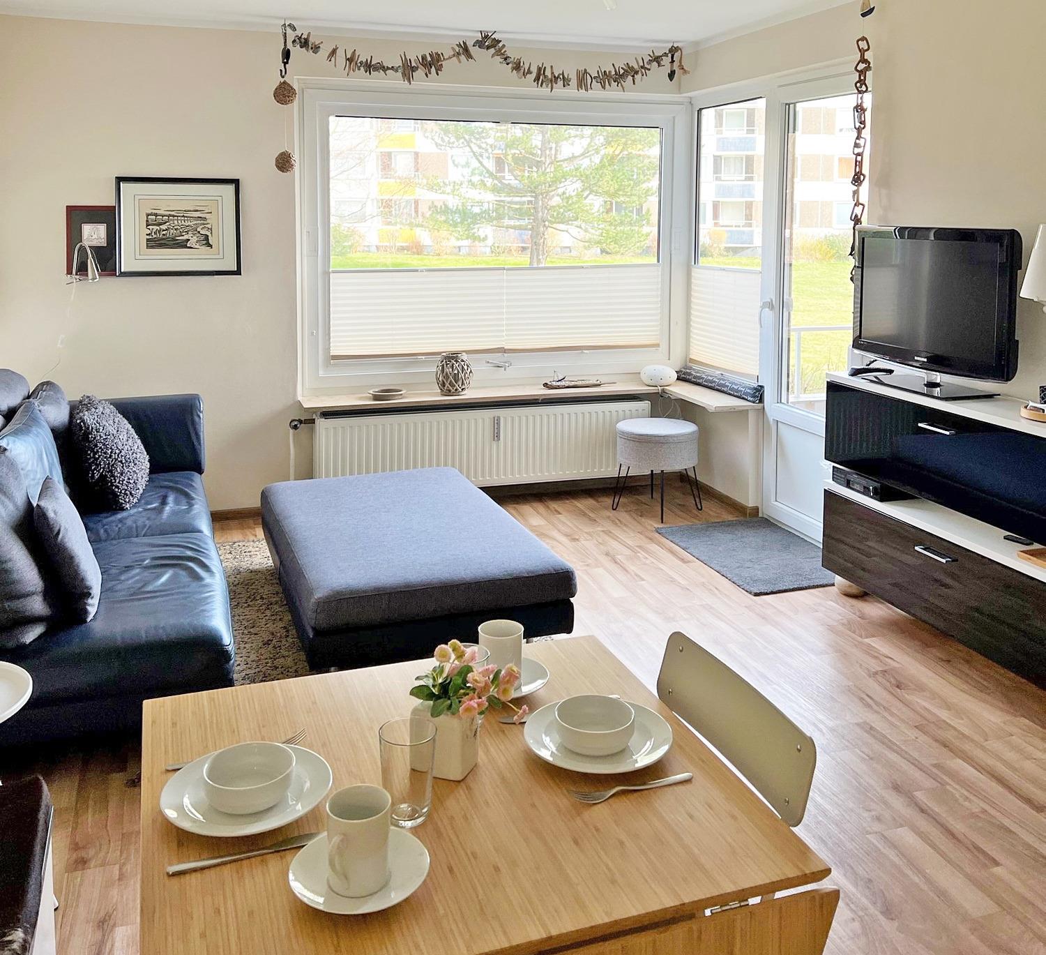 Die Wohnung verfügt über ein helles, freundliches Wohnzimmer. Ein Esstisch mit Sitzbank trennt die offene, moderne Küche vom Wohnzimmer. Genießen Sie gemütliche Abende auf der modernen Couch; vom Wohnzimmer gelangen Sie auf den möblierten Balkon mit Ostausrichtung.