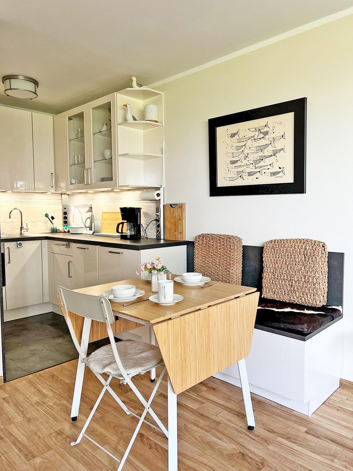 Die voll ausgestattete Küche bietet unter anderem einen Induktionsherd, Backofen, Kühlschrank mit Gefrierfach, Spülmaschine und weitere kleine Küchenhelfer wie Kaffeemaschine, Wasserkocher und Toaster.