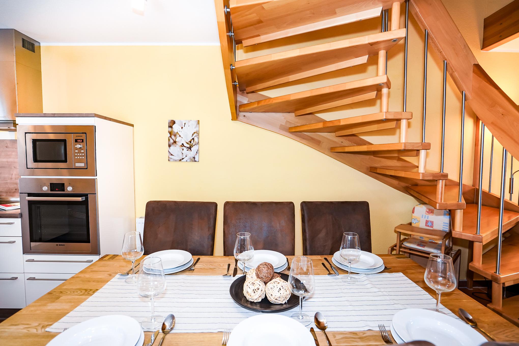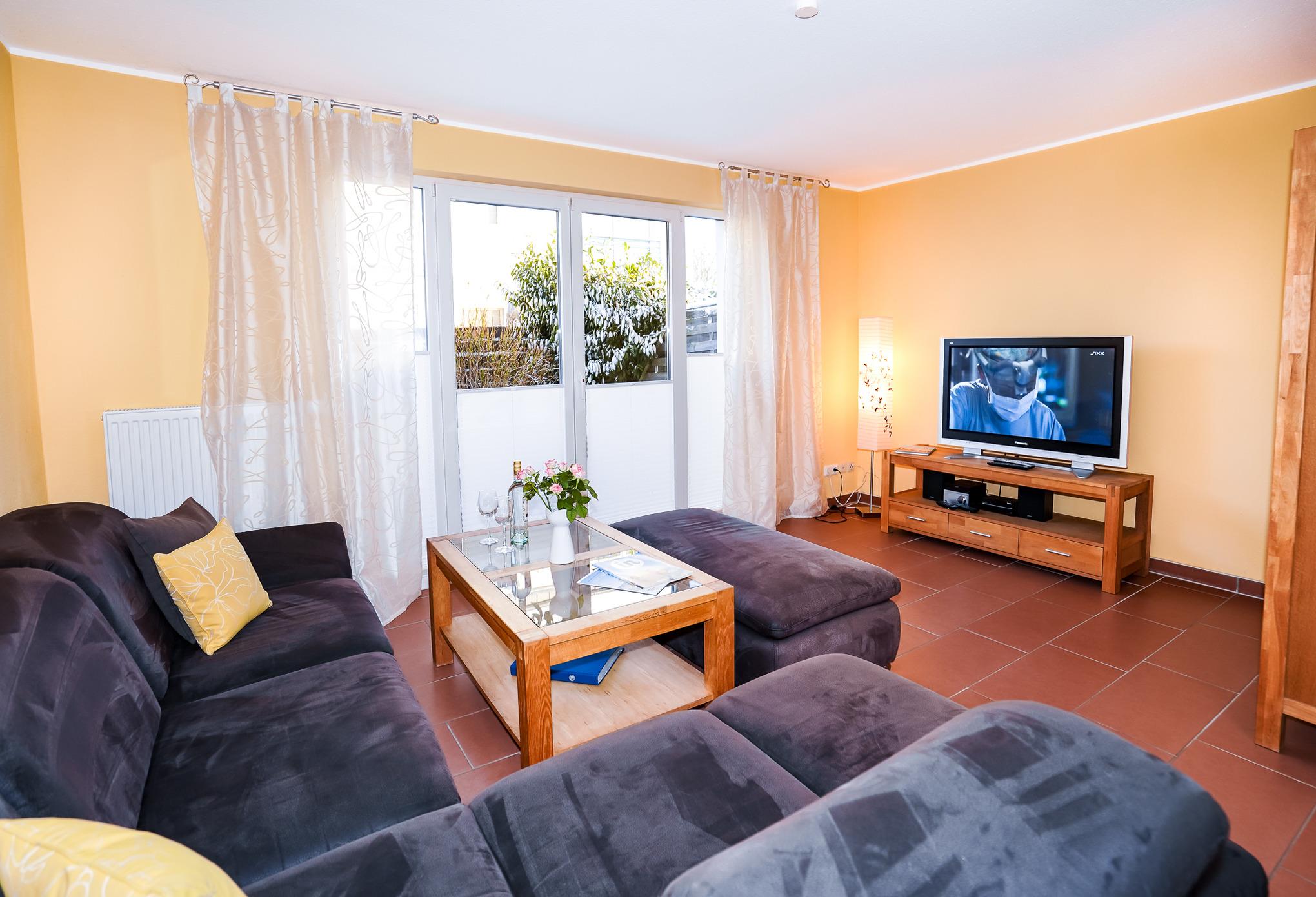 Das modern ausgestattete helle Wohn- und Esszimmer hat einen direkten Zugang zur Terrasse und ist mit einer gemütlichen Eckcouch, einem Sessel, einem großen Esstisch und einer Vitrine ausgestattet. Zur Unterhaltung stehen ein großer Flachbildfernseher, eine Mini-Stereoanlage und selbstverständlich kostenloses W-LAN zur Verfügung. Ein Holzkohlegrill auf der Terrasse lädt zum gemütlichen Grillen ein.