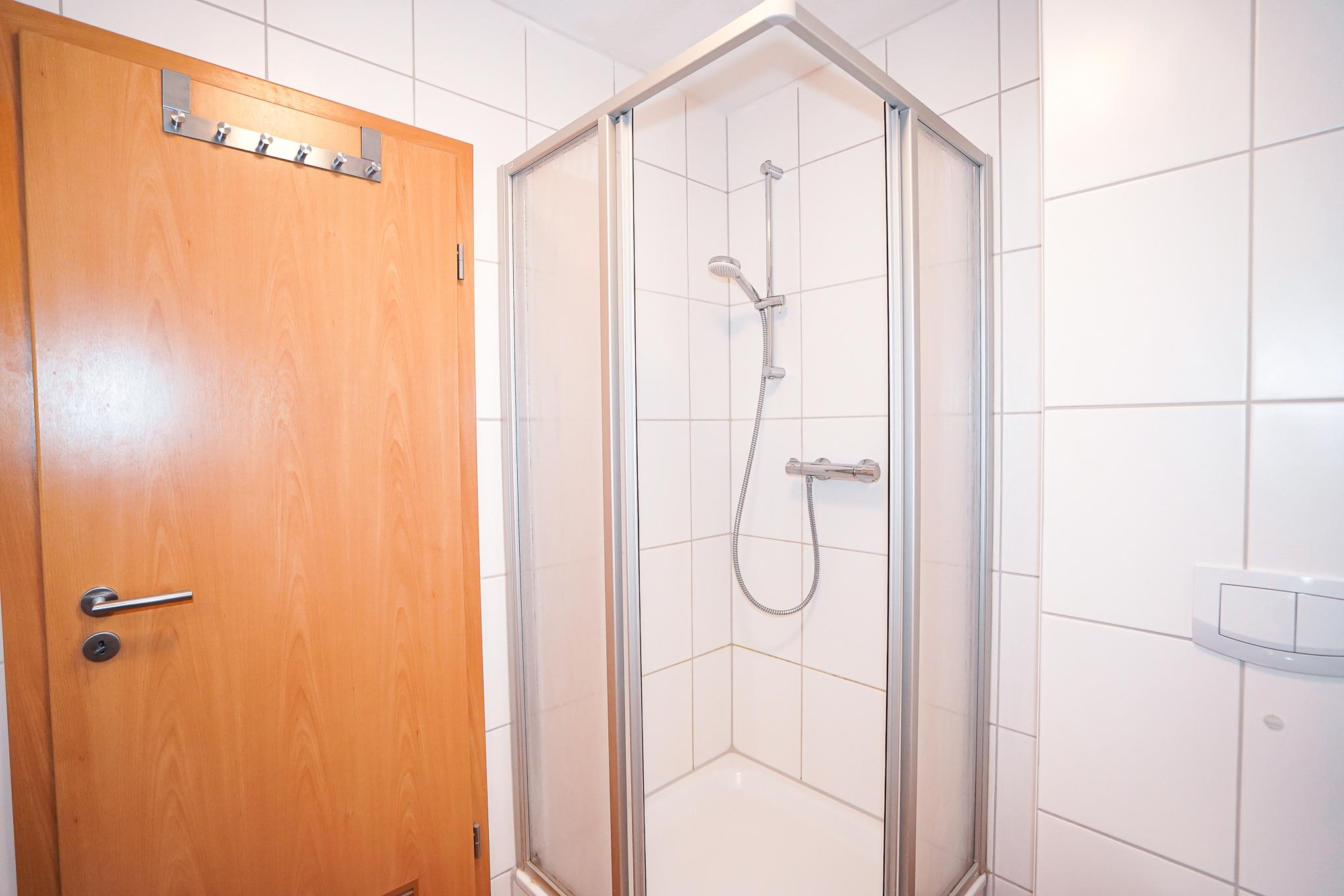 Ergänzt wird das erste Obergeschoss durch ein helles Badezimmer mit einer Eckdusche.