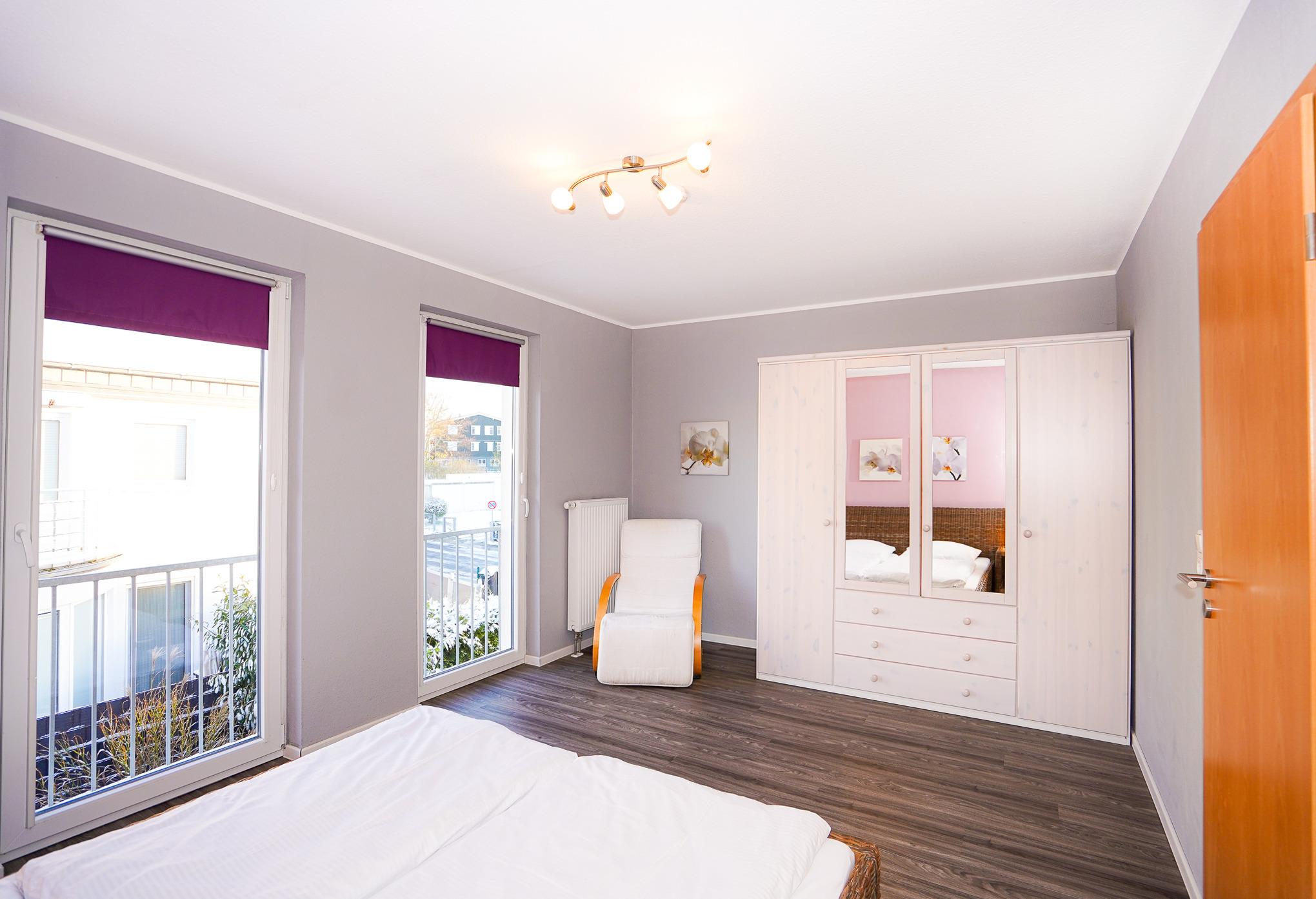 Das Hauptschlafzimmer im 1.OG verfügt über ein Doppelbett (2x90x200cm), einen Fernseher und einen großen Kleiderschrank. Die bodentiefen Fenster lassen bereits zum Morgen die ersten Sonnenstrahlen rein. Ein zweites Schlafzimmer ist mit zwei Einzelbetten und ebenfalls einem Kleiderschrank ausgestattet. Im dritten Schlafzimmer finden Sie ein Hochbett sowie einen Kleiderschrank vor. Alle Fenster lassen sich durch Rollos verdunkeln.