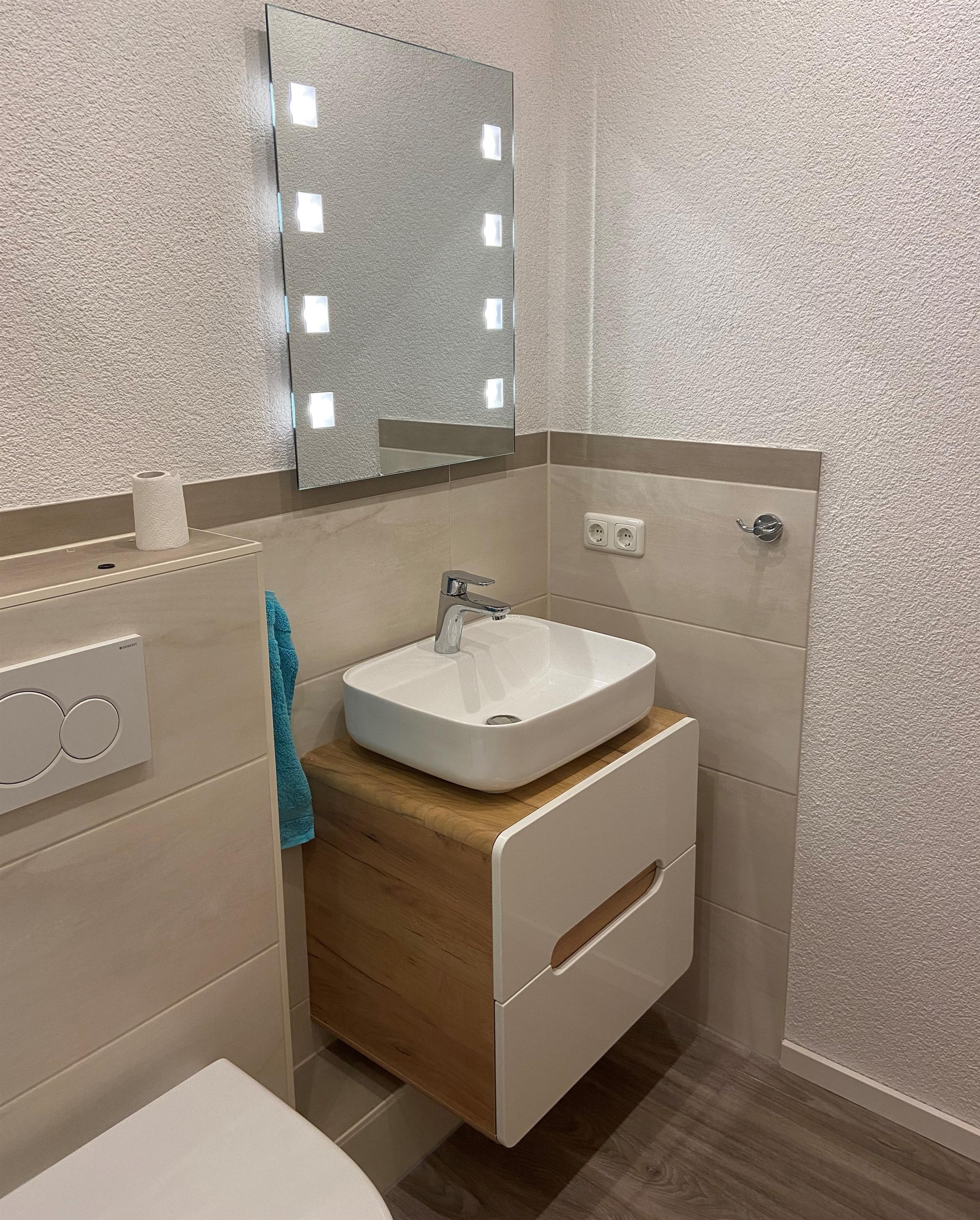 1 hell gefliestes Bad/WC mit Föhn und Personenwaage.