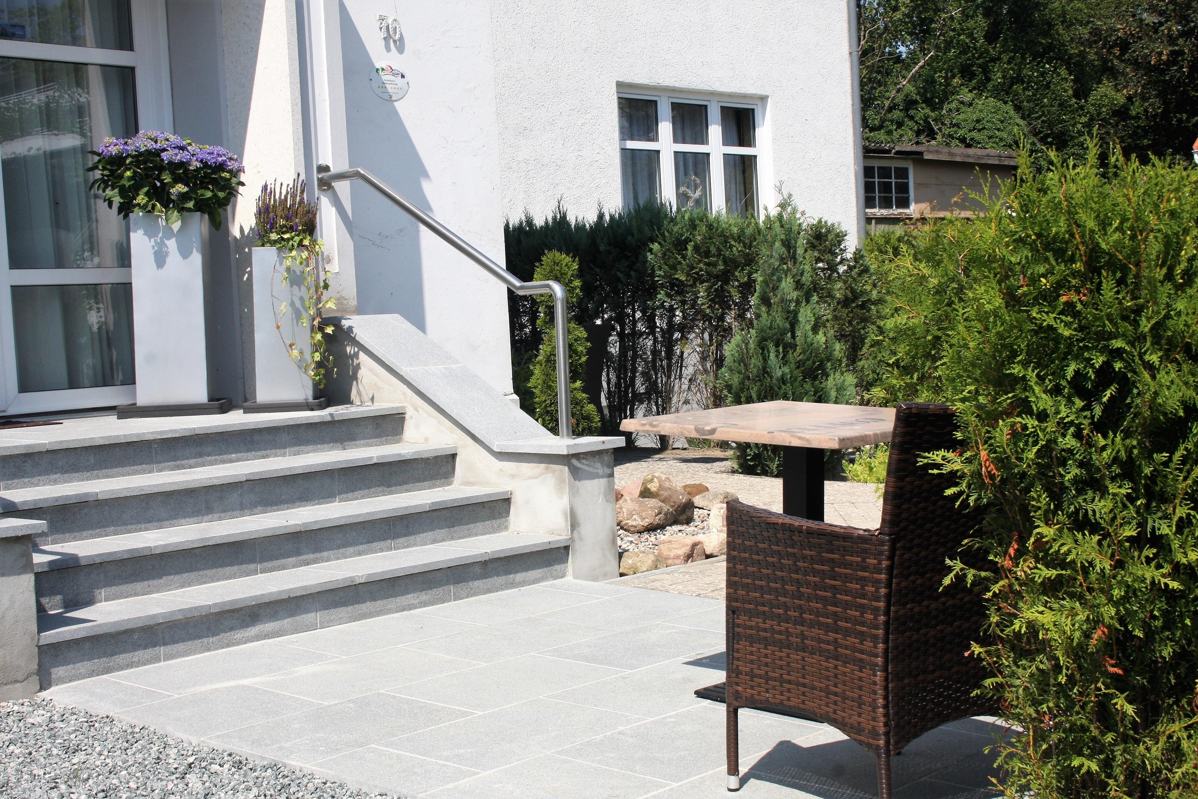 1 gemütlichen Wohnraum mit Essplatz, einem Flachbild-TV, DVD-Player, Stereoanlage, WLAN. Eine zweiflügelige Terrassentür führt auf zwei, mit bequemen Gartenmöbeln aus Polyrattan bestuhlte, Terrassen.