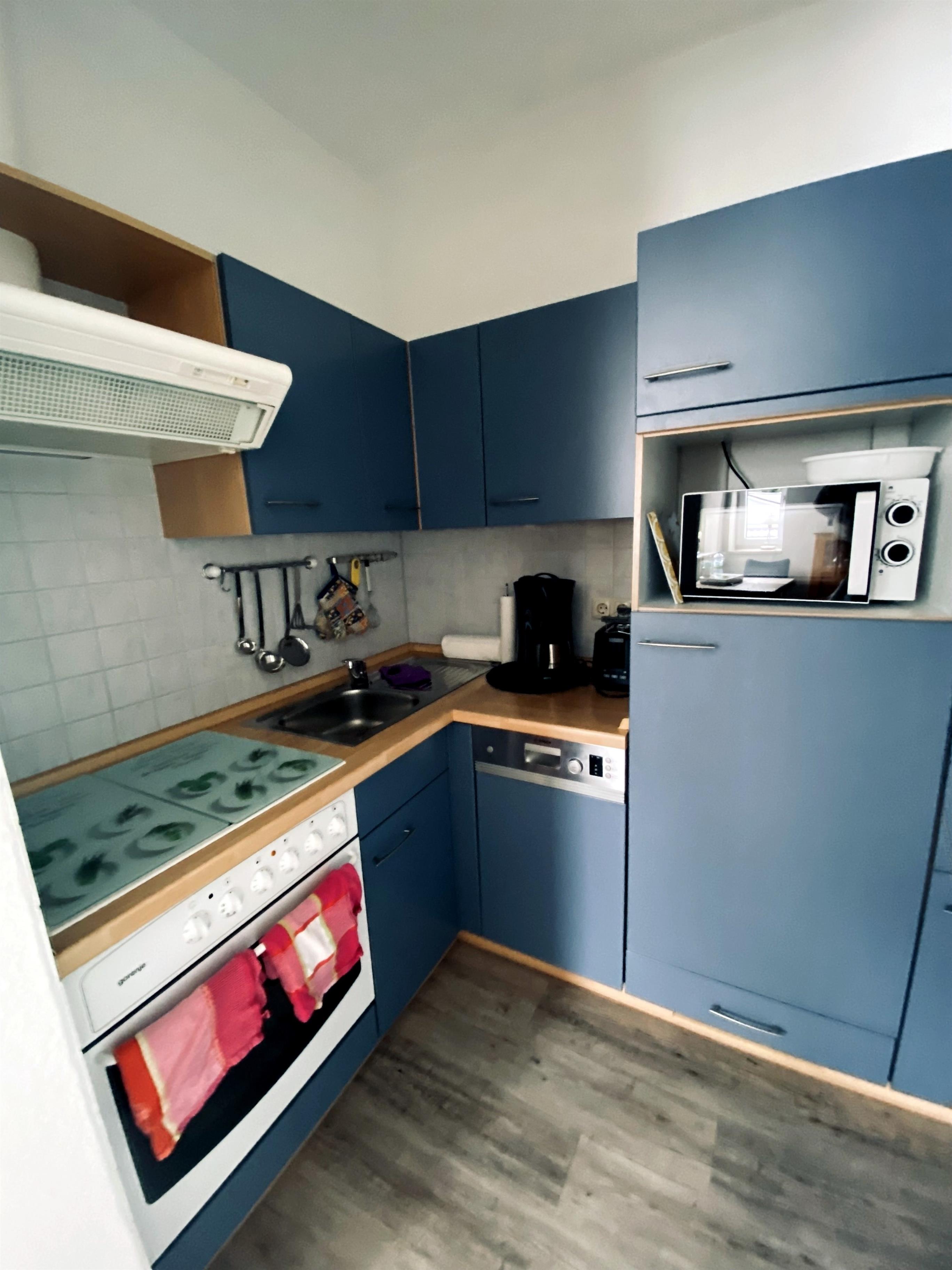 1 komplett ausgestattete Küche mit Ceranfeld, Backofen, Geschirrspüler, Mikrowelle, Toaster, Wasserkocher, Kaffeemaschine.