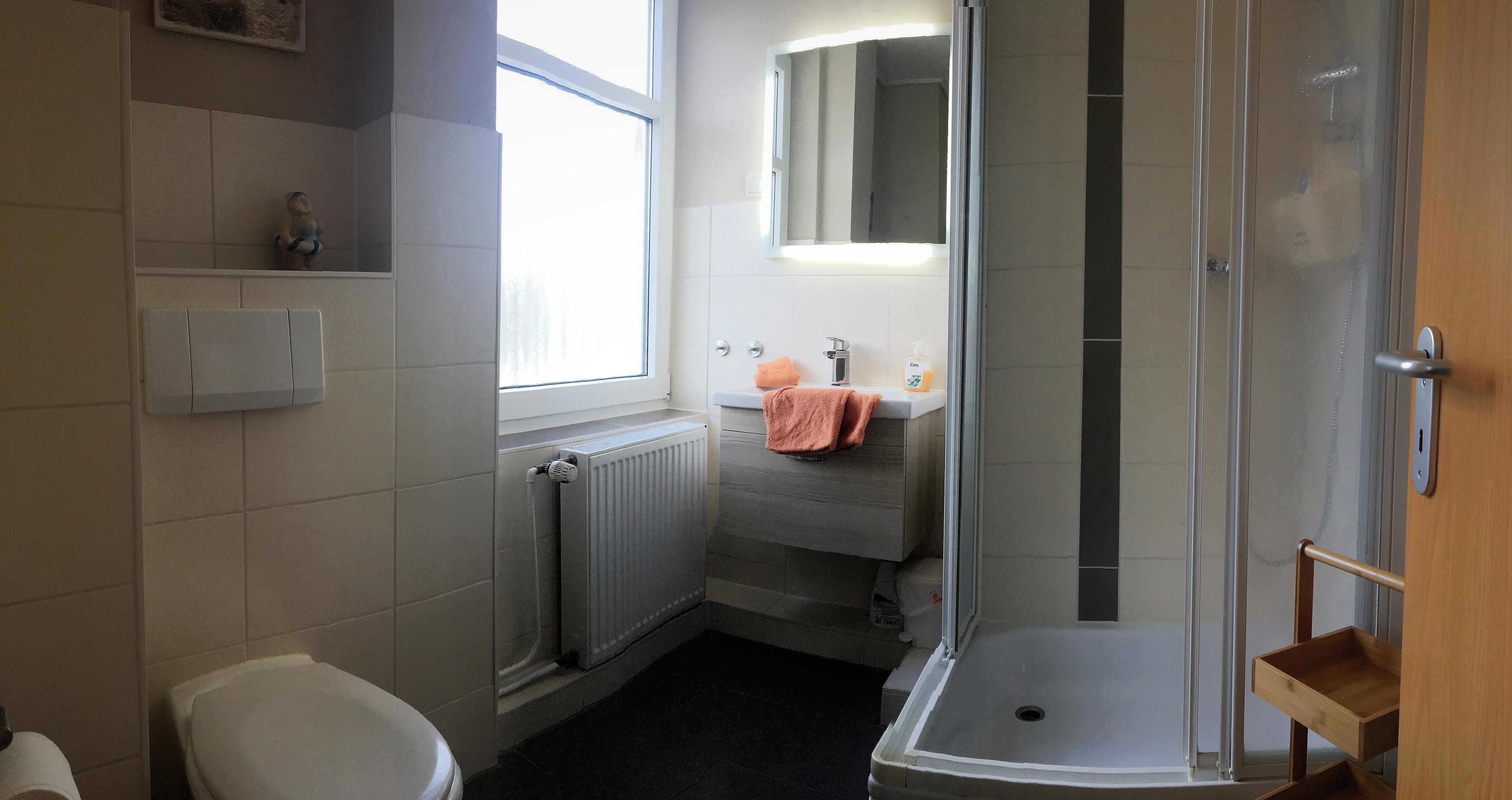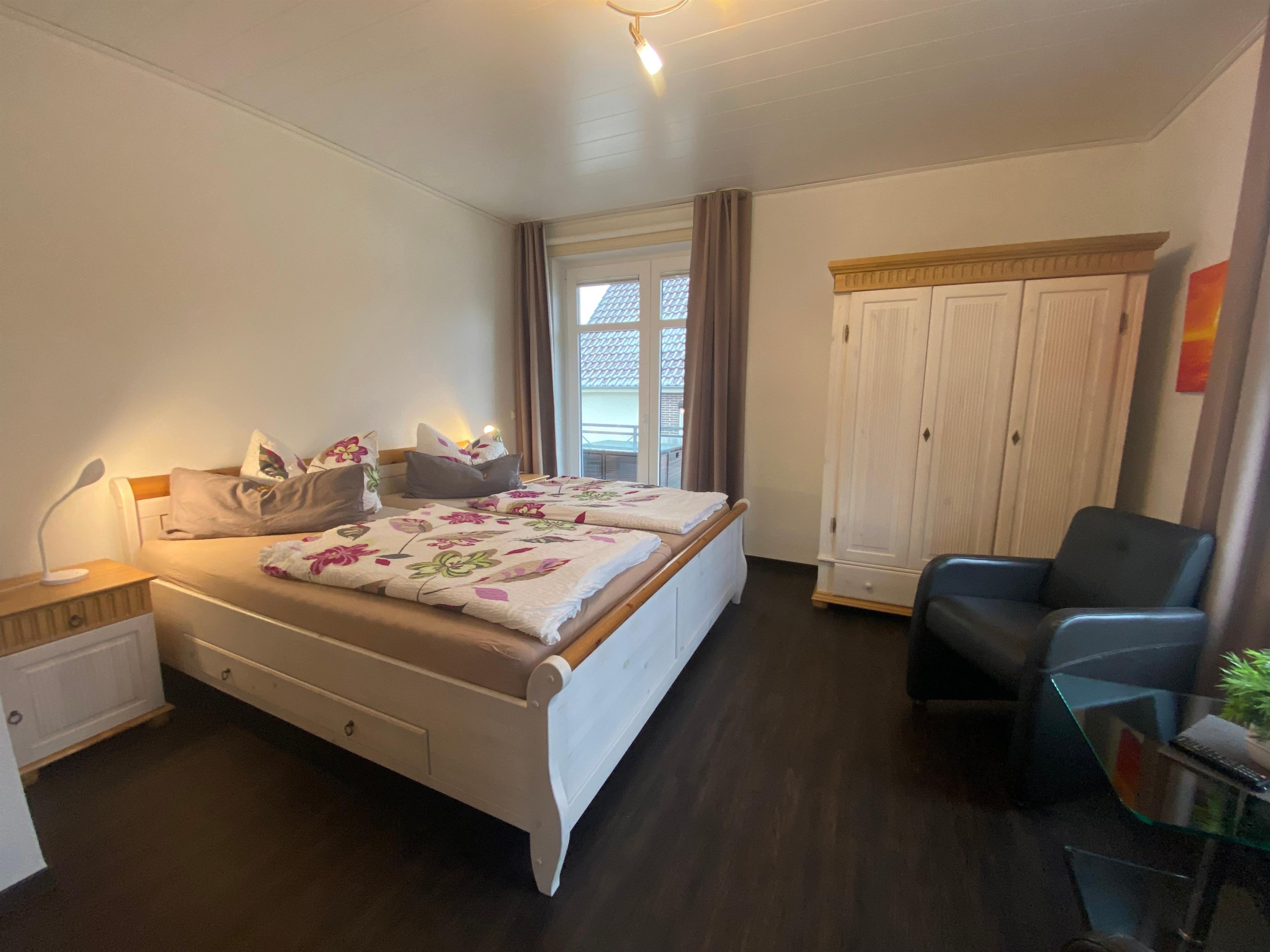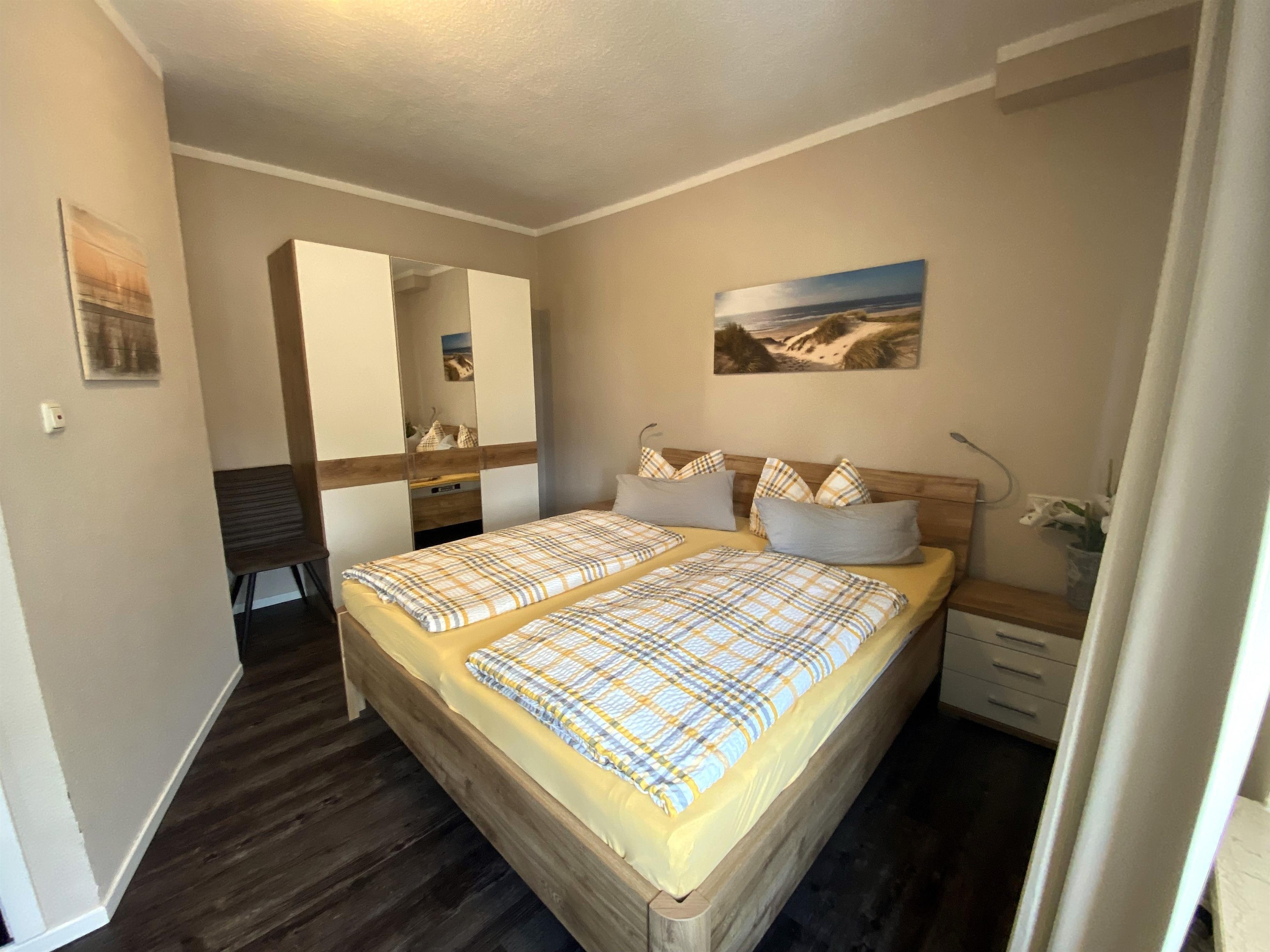 1 Schlafraum mit Doppelbett und angrenzendem kombinierten Bad/WC mit Föhn und Personenwaage