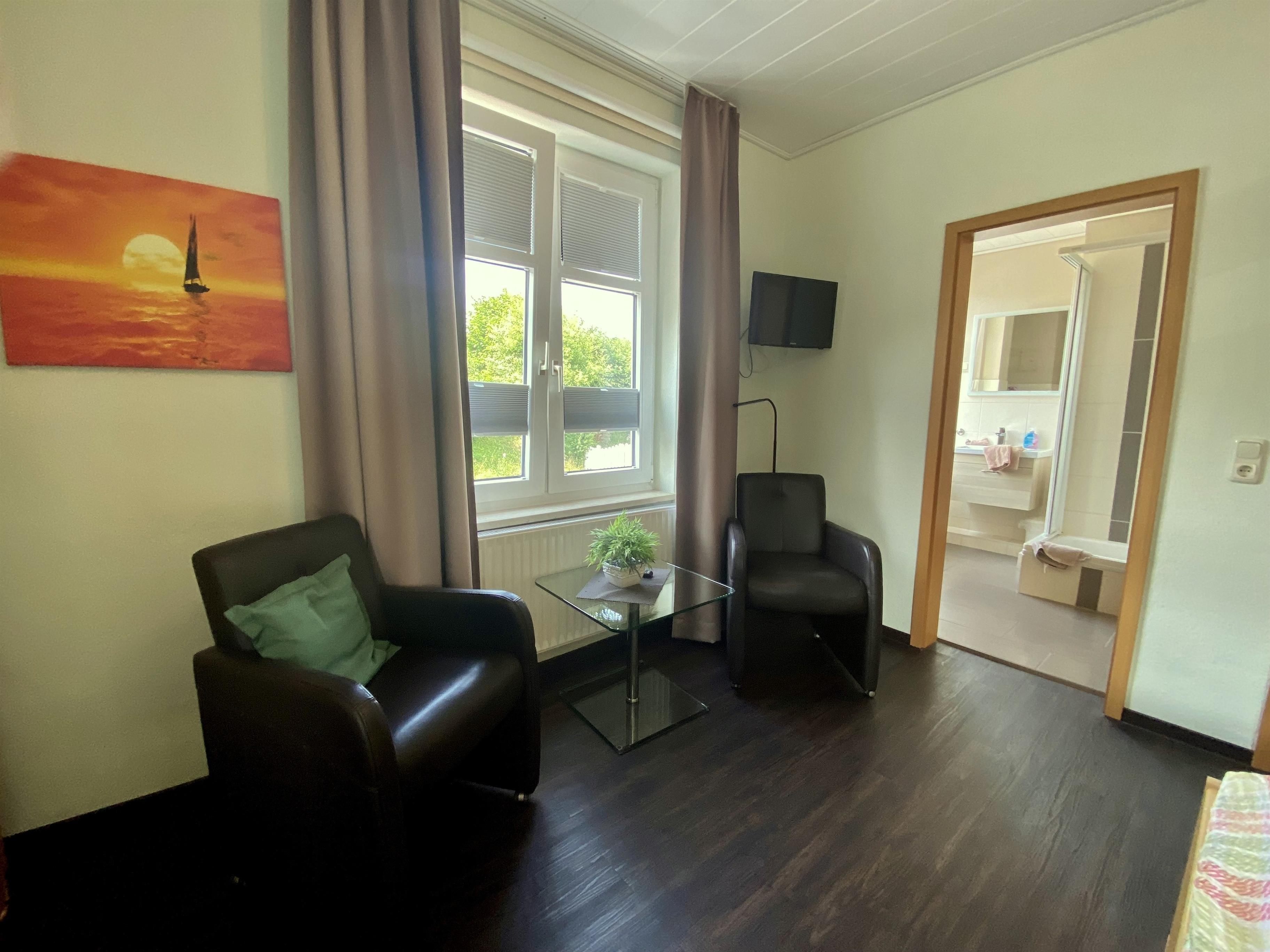 1 Schlafraum mit Doppelbett und Platz für ein Zustell- oder Kinderbett und angrenzendem kombinierten Bad/WC mit Föhn sowie ein Flachbild TV und einer Sitzecke.