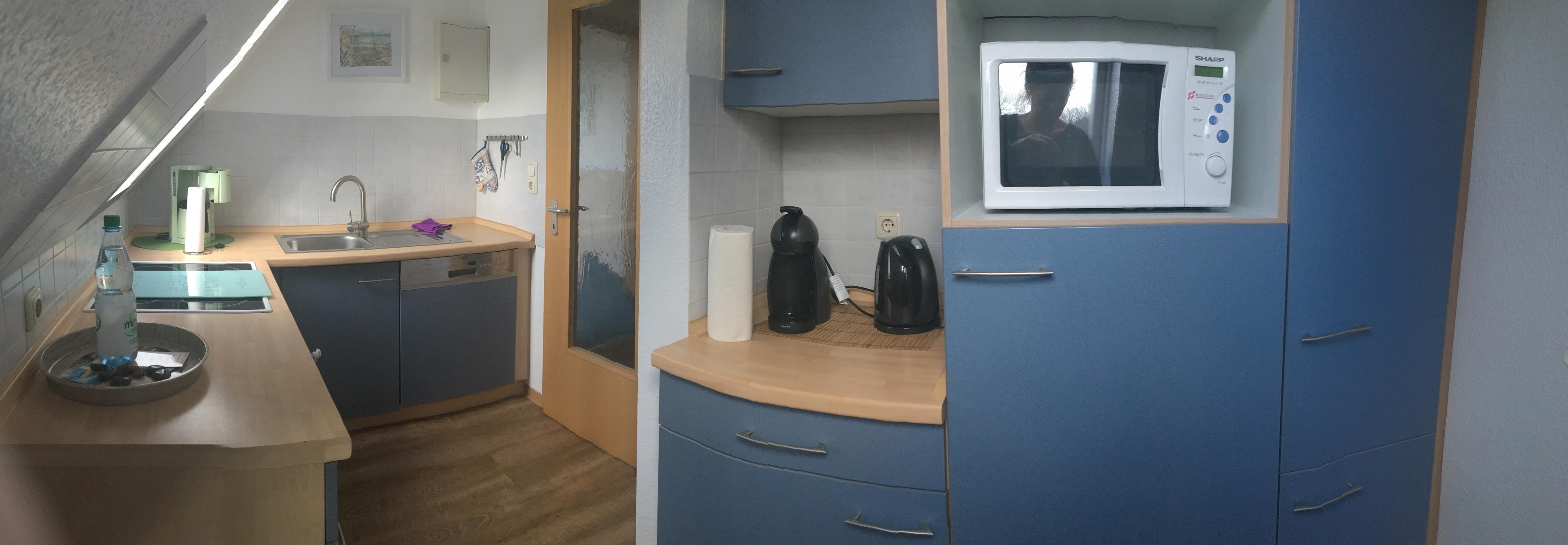 1 komplett ausgestattete Küche mit Ceranfeld, Backofen, Geschirrspüler, Mikrowelle, Toaster, Mixer, Kaffeemaschine, Wasserkocher