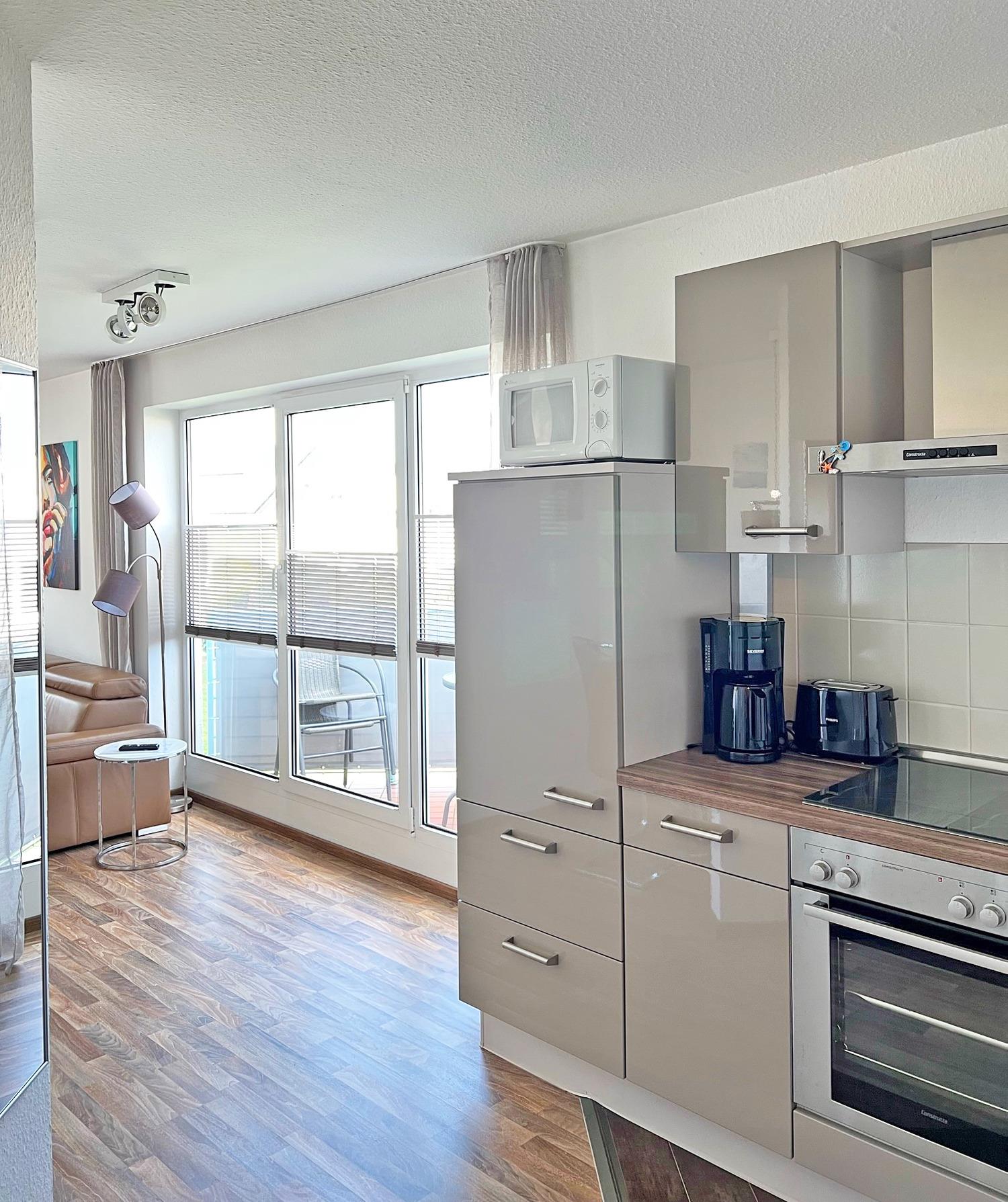 Die offene und moderne Küche ist mit allen wichtigen Utensilien ausgestattet. Im Flur können Sie Ihre Garderobe ablegen und Ihre Schuhe in den Seitenschrank abstellen.