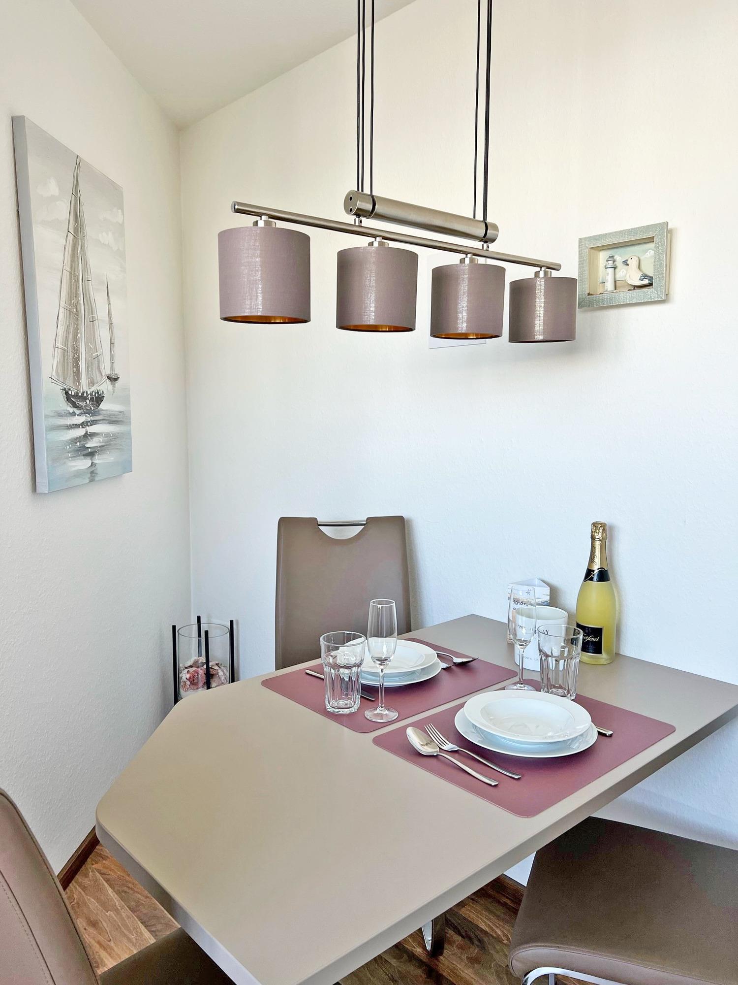 Es erwartet Sie ein helles Wohnzimmer mit einem großen und bequemen Ledersofa, einem Couchtisch und einem großen Fernseher sowie Schränke, einige Gesellschaftsspiele und Bücher stehen Ihnen zur Verfügung. Das große Fenster verfügt über eine Außenjalousie; Innenjalousien machen den Wohnraum gemütlich. Ein kleiner Balkon, ausreichend für 2 Personen, steht Ihnen zur Verfügung. Angrenzend an das Wohnzimmer befindet sich ein separater Essbereich.