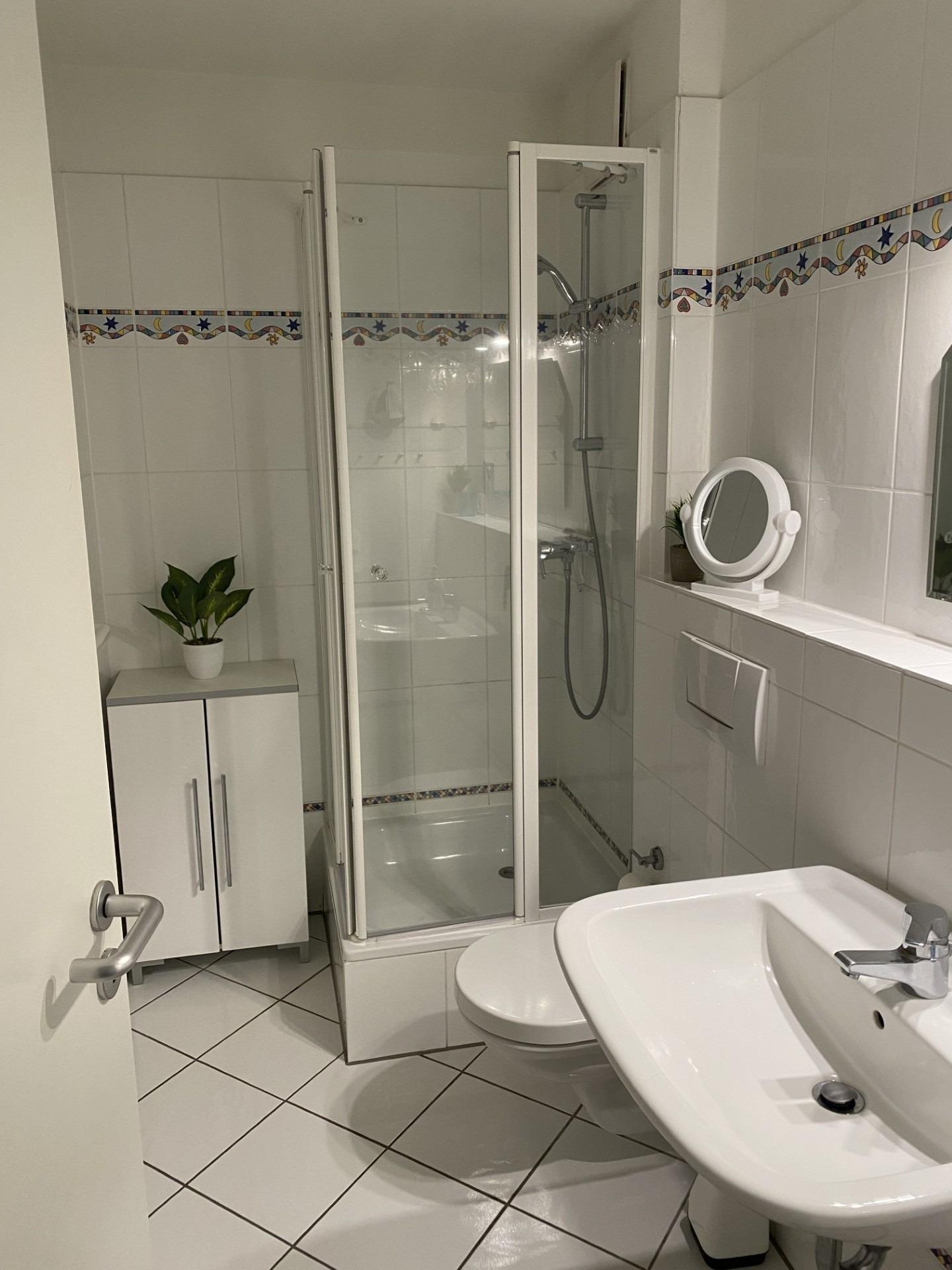 Die Badausstattung besteht aus einem Waschbecken, einem WC und einer Dusche mit Trennwand.