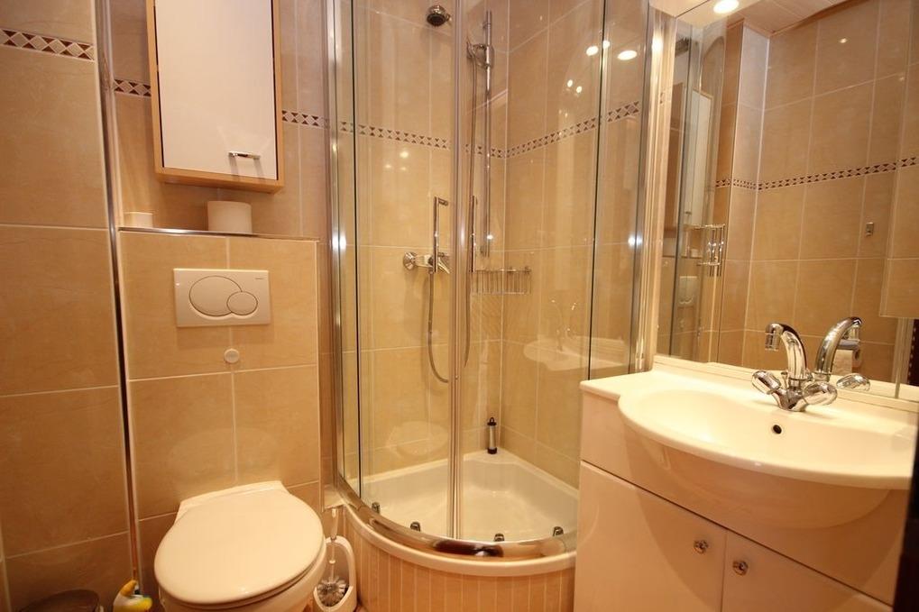Modernes, gefliestes Bad mit Rundglasdusche, Waschbecken und WC.