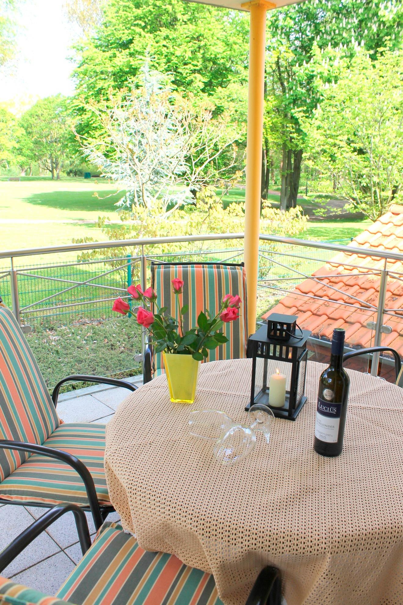 Der gemütliche Wohnbereich ist mit einer Sitzecke, Flachbild-TV, Stereoanlage und DVD-Player versehen. Kostenloses WLAN ist vorhanden. Vom Wohnbereich aus haben Sie Zugang zum möblierten West-Balkon mit herrlichem Blick auf den Grömitzer Kurpark.
