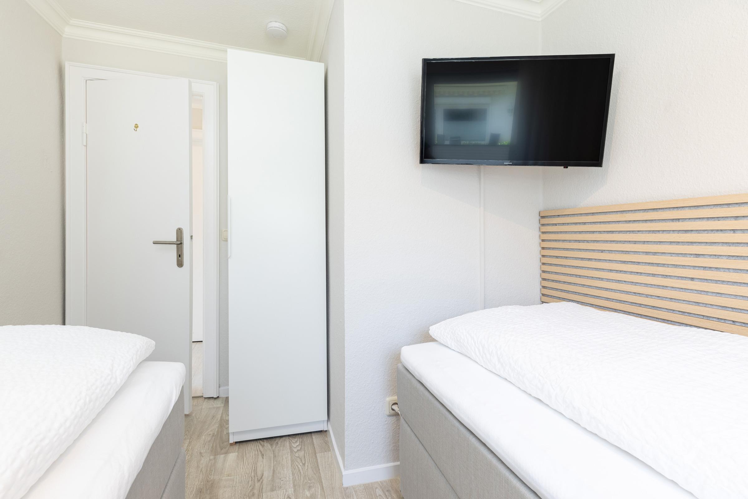 - Zwei Schlafräume mit Boxspring-Betten: ein Doppelbett (180x200) und zwei Einzelbetten (90x200)