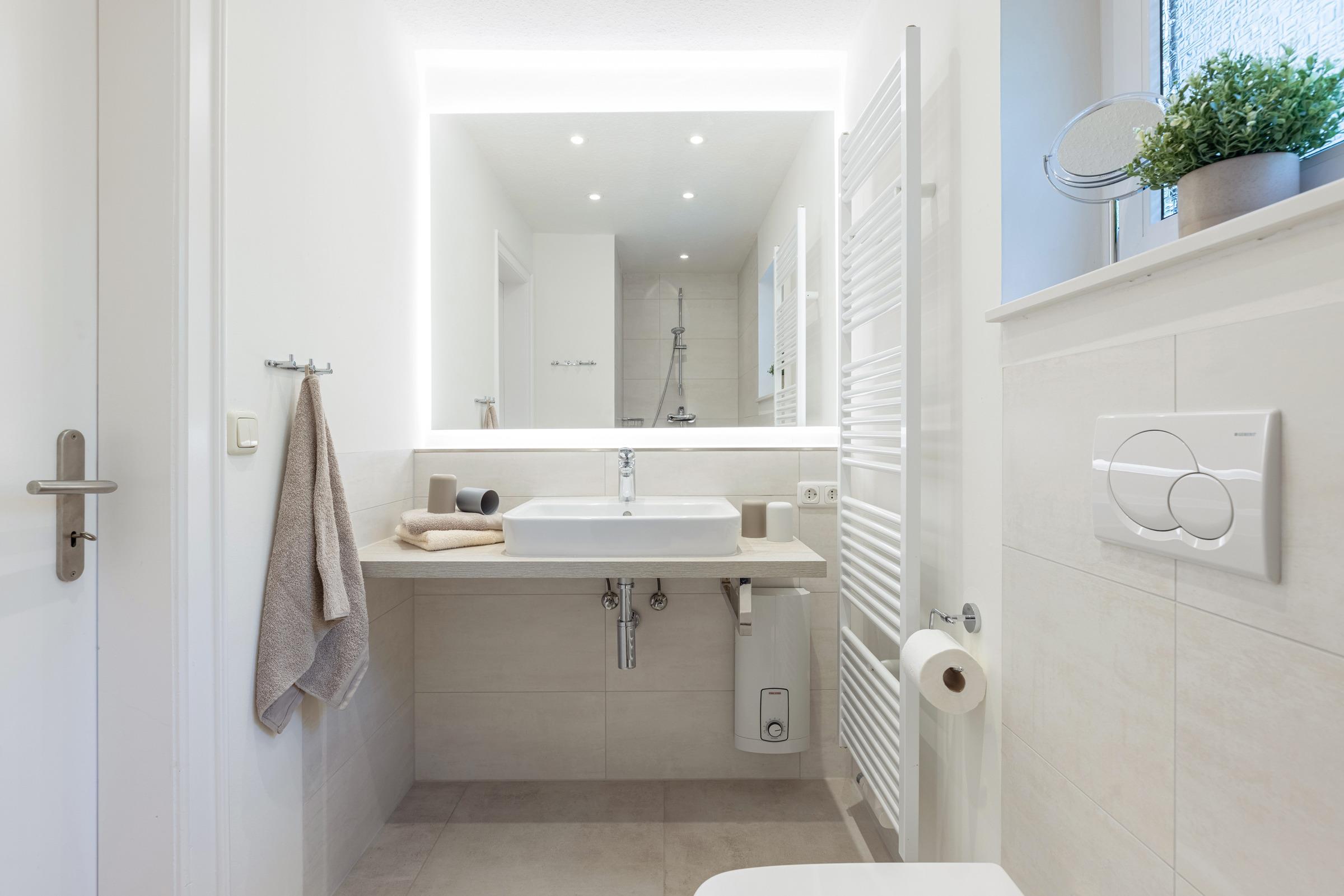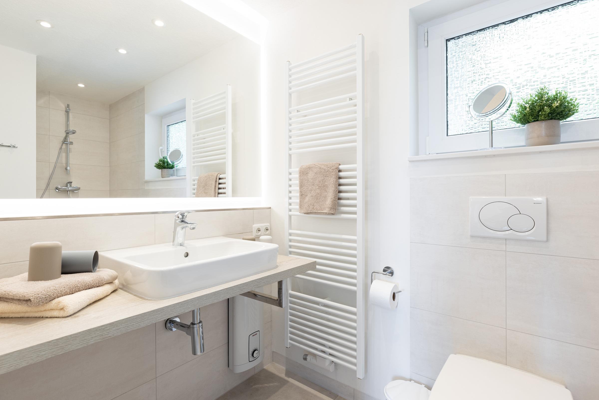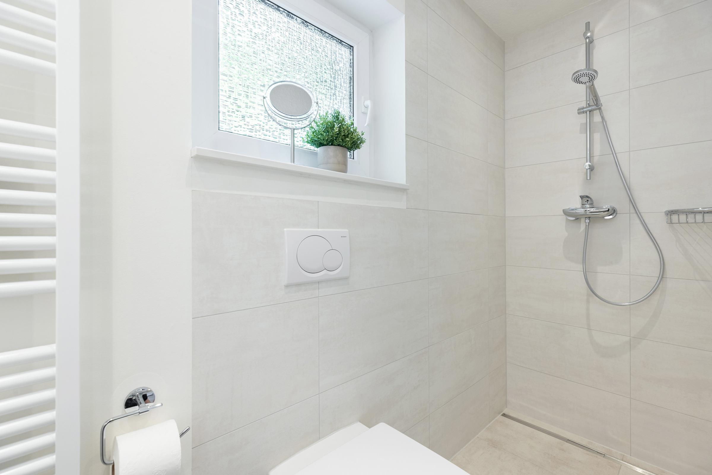 - Ein modernes Badezimmer mit ebenerdiger Dusche