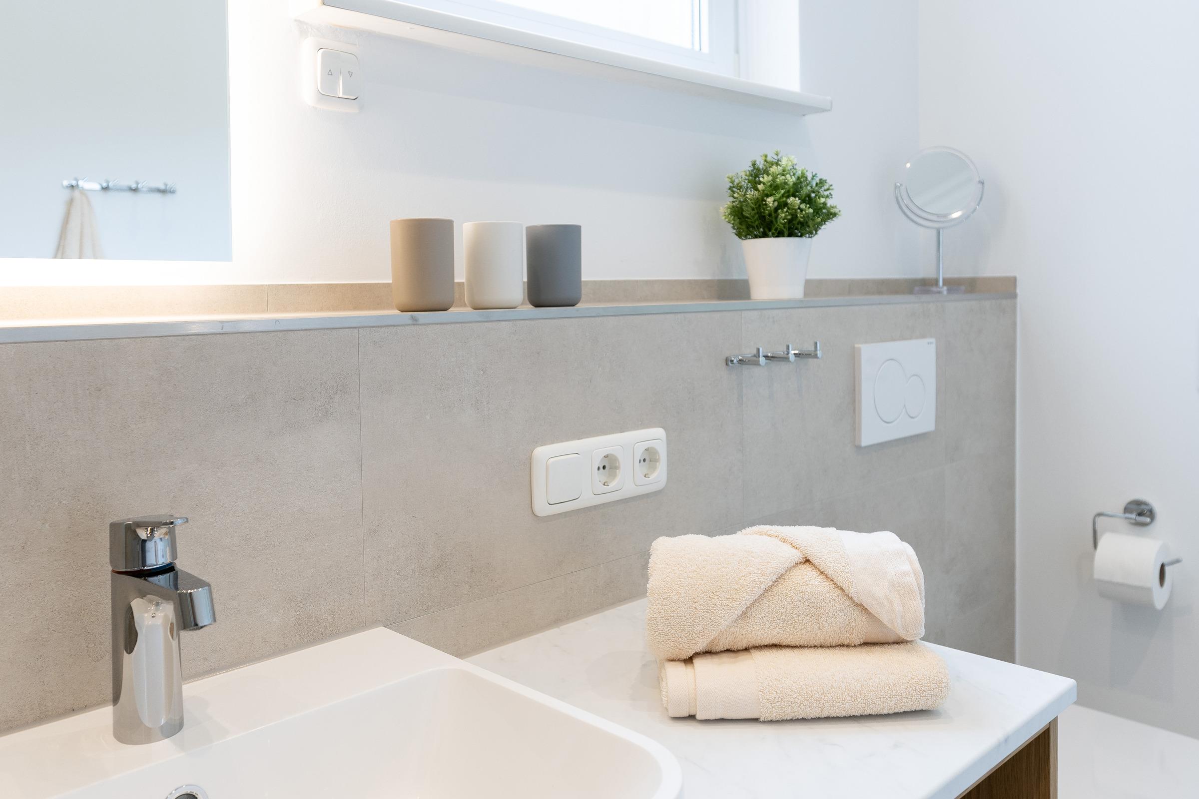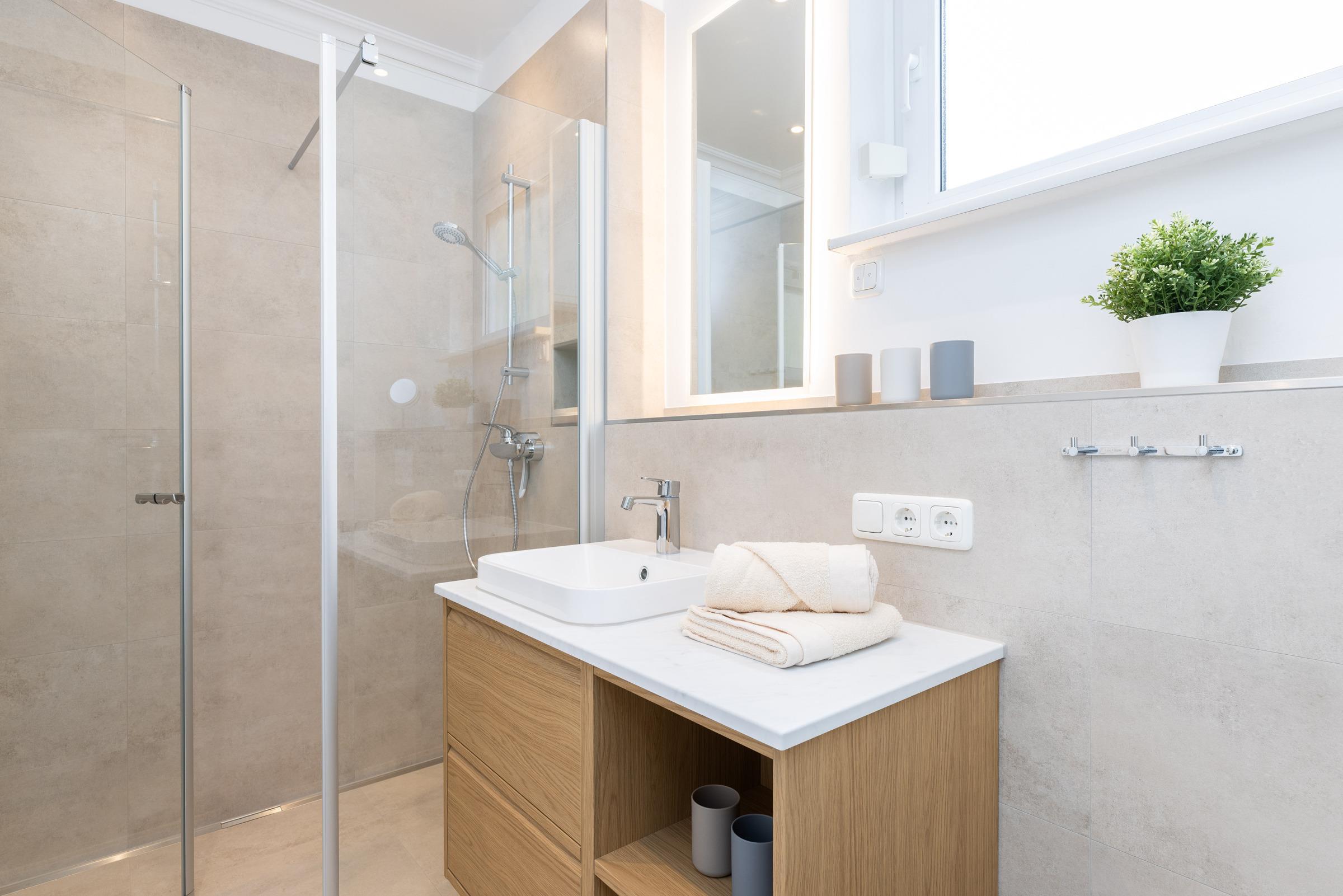 - Hochmodernes Badezimmer: Hell und einladend mit begehbarer Dusche