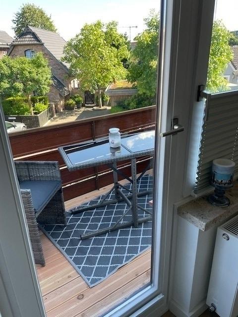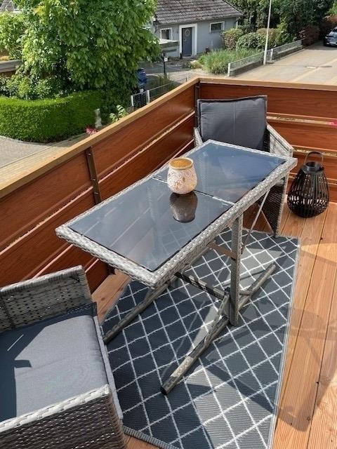 Erholen Sie sich auf dem Balkon, der mit Tisch und Stühlen ausgestattet ist. Ein kostenloser PKW-Parkplatz ist vorhanden, und bis zu zwei Fahrräder können sicher im verschließbaren Fahrradhaus untergestellt werden.
