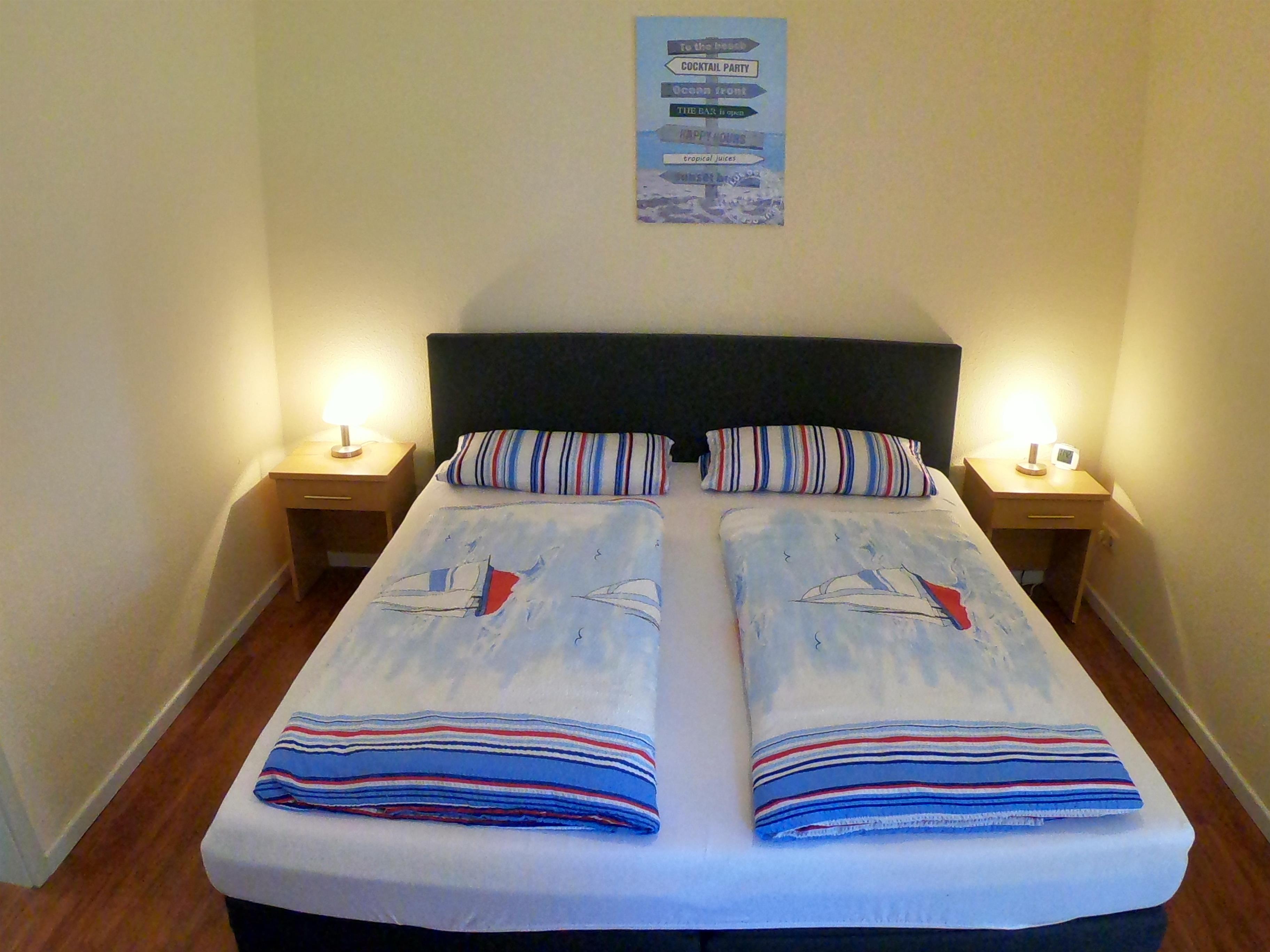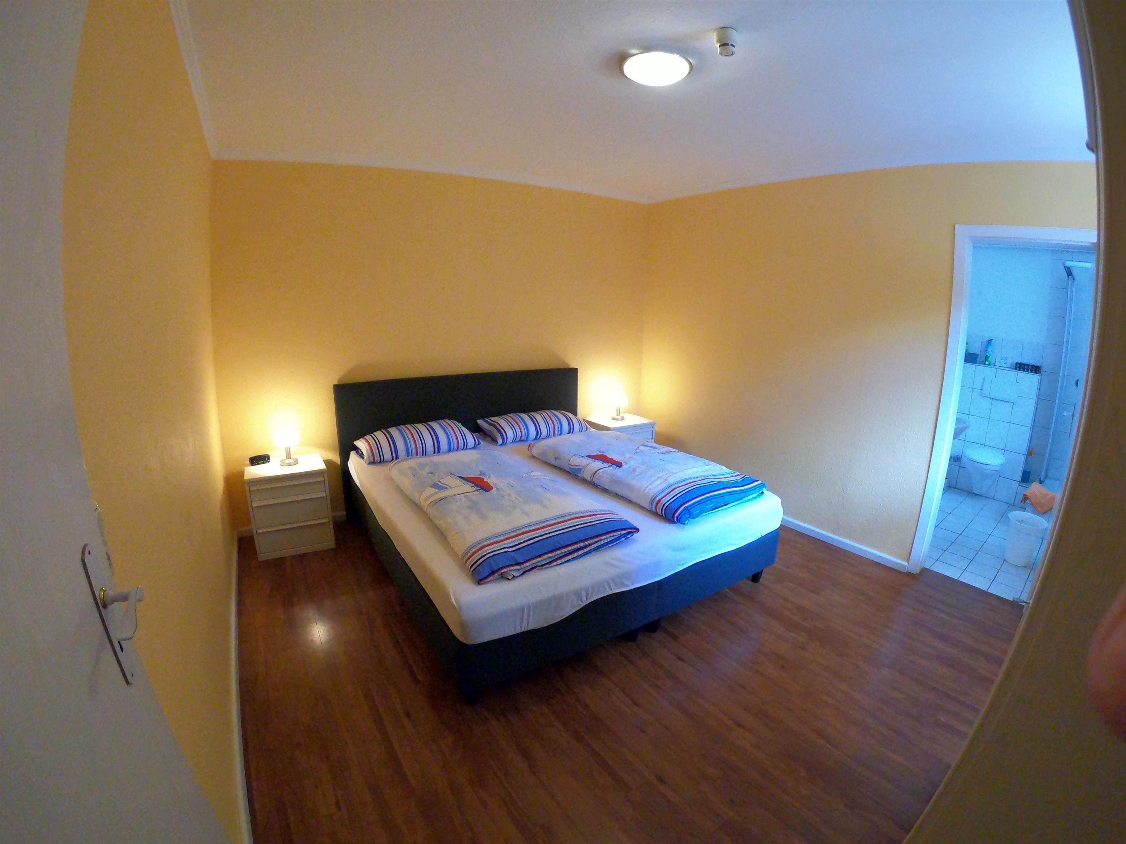 durchgehende Matratze) sowie einem großen Kleiderschrank versehen, zu jedem Schlafzimmer gehört ein Tageslicht-Badezimmer, die Bäder sind mit Waschbecken, Dusche und WC ausgestattet. In einem der Bäder befindet sich eine Waschmaschine.