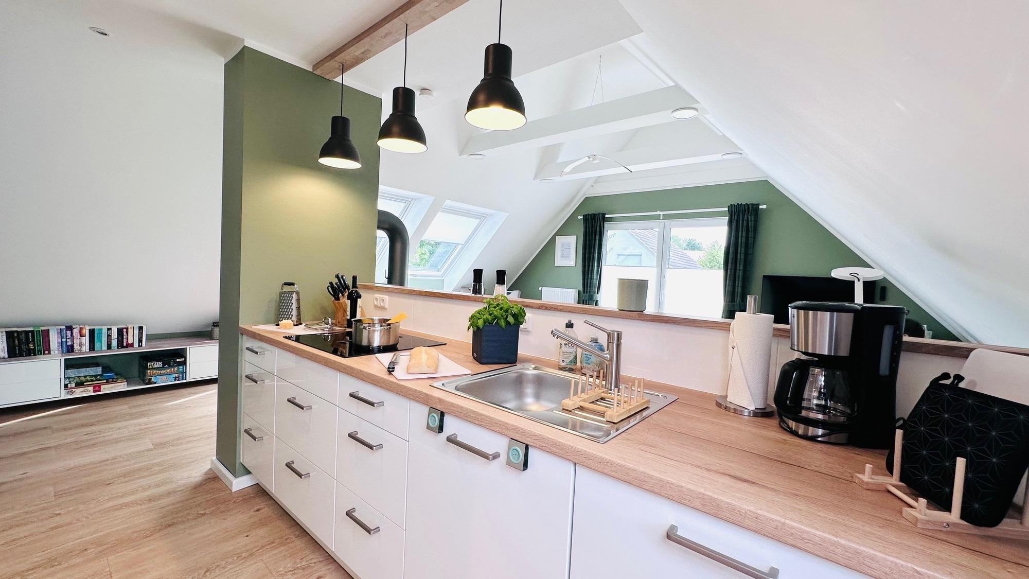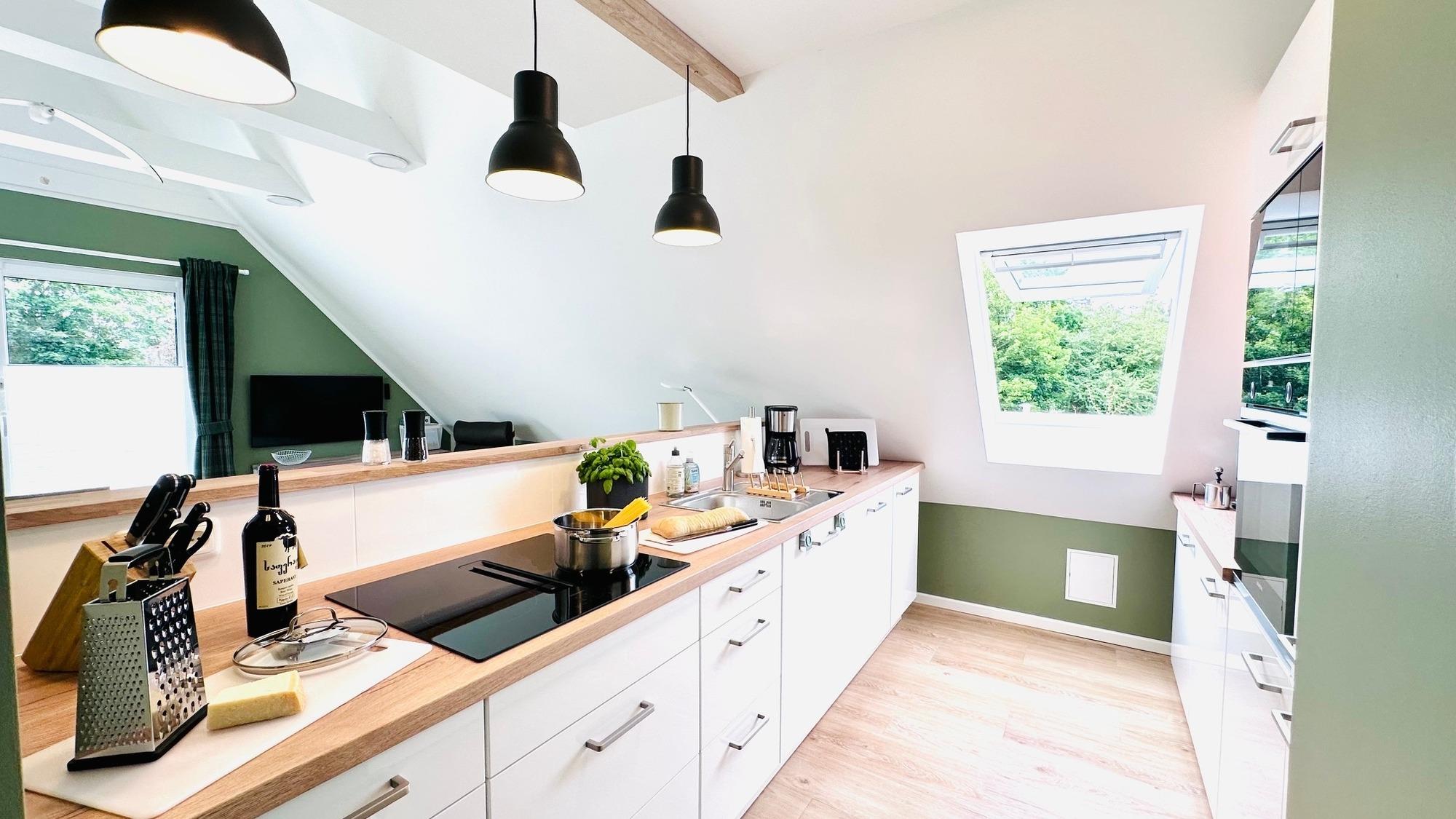 Die hochwertige, offene Küche ist an das Wohn-/Esszimmer angegliedert. Gesellige Kocherlebnisse sind möglich, denn es ist alles vorhanden: Backofen, Mikrowelle, Spülmaschine, Kühlschrank, Gefrierfach, Induktionskochfeld und div. Elektrogeräte (z.B. Kaffeemaschine, Kapselmaschine, Toaster). Aber auch die kleinen Dinge, wie ausreichend Küchengeschirr, Geschirrhandtücher, Backpapier, Spülmaschinen-Tabs und vieles mehr stehen bereit.