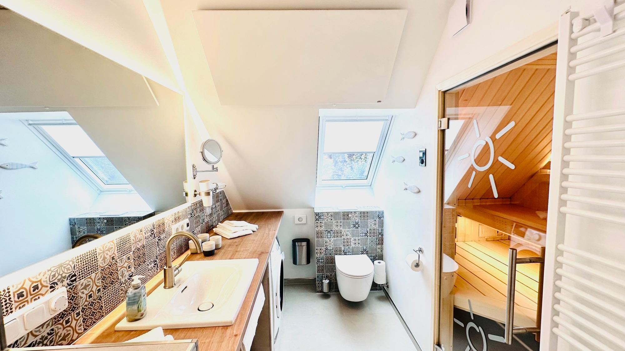 Zu den echten Highlights zählen der Kaminofen im Wohnzimmer, ein Wellness-Badezimmer mit eigener finnische Sauna.