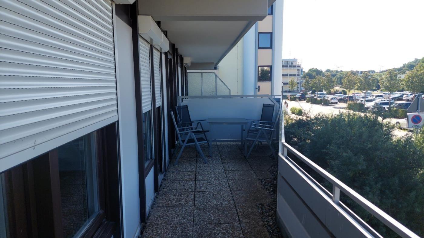 Sie hat einen 25qm großen Balkon, den Sie vom Wohnzimmer oder auch der beiden Schlafzimmer begehen können. Zur Wohnung gehört ein Tiefgaragenstellplatz