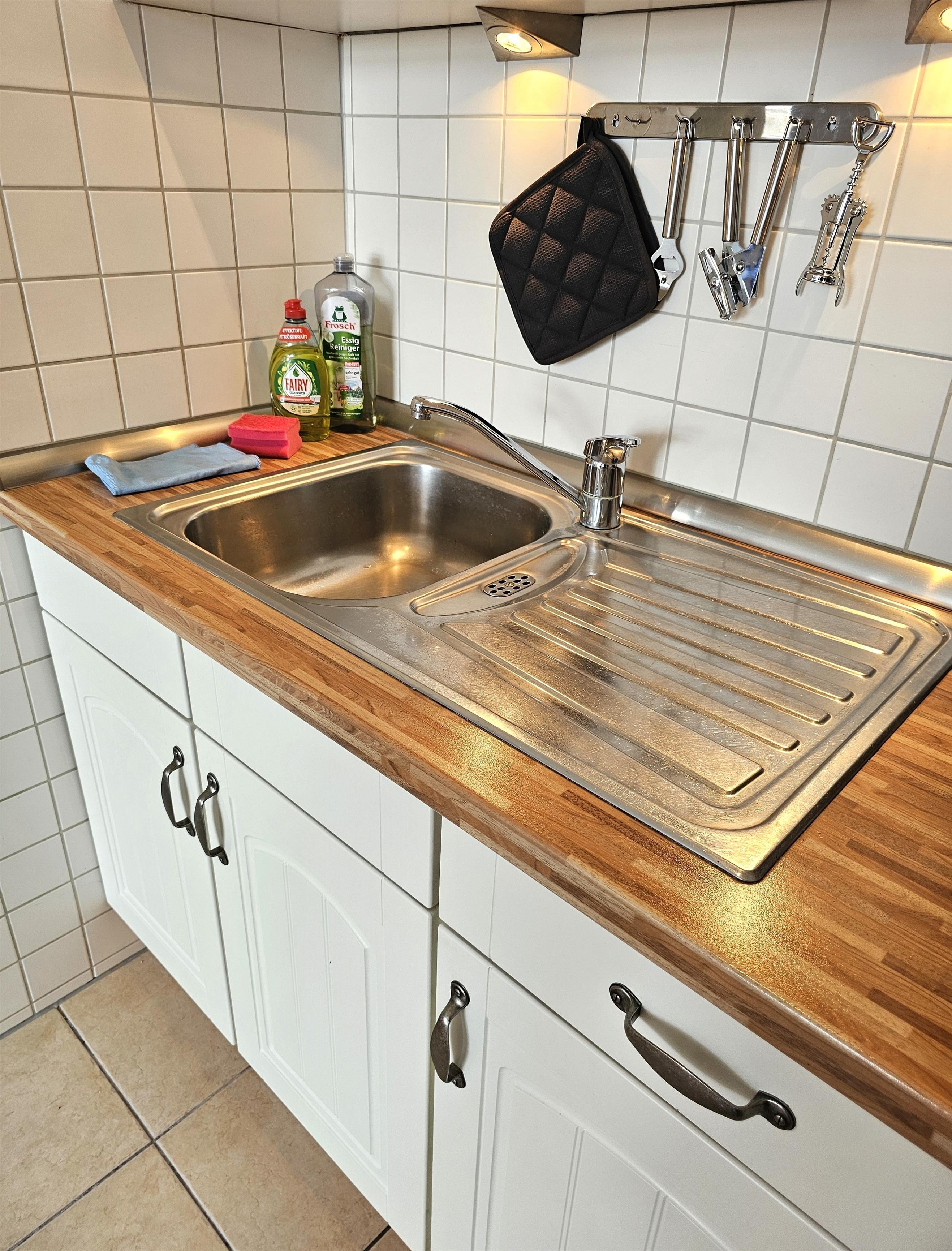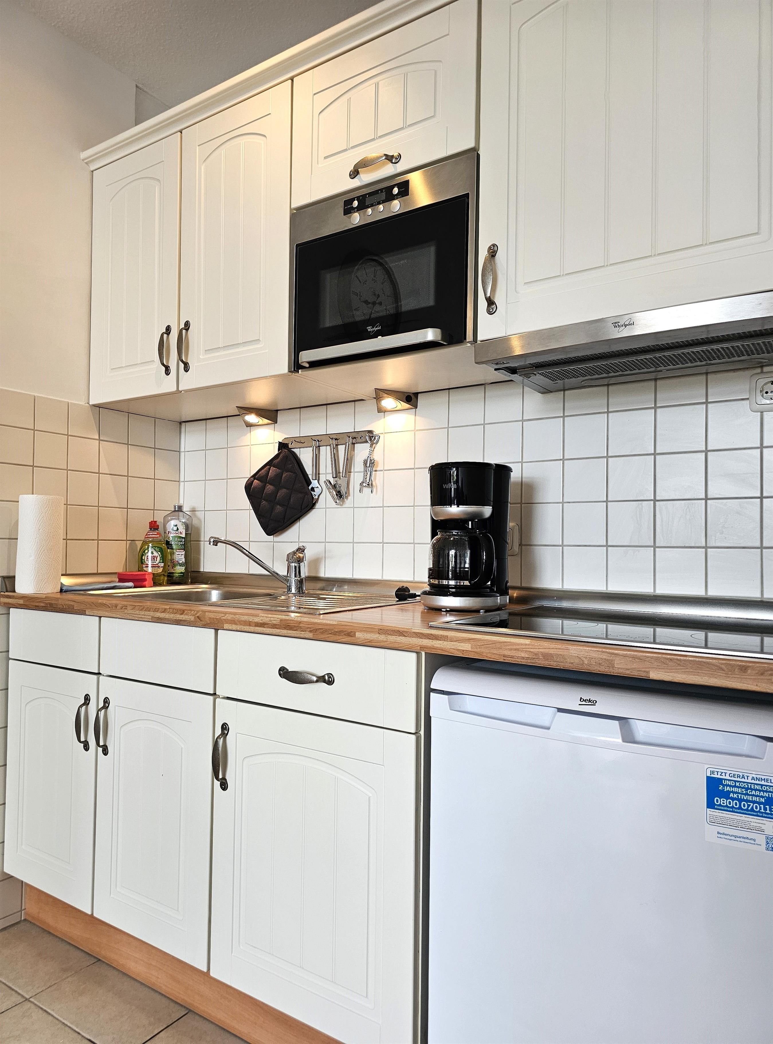 Der offene Wohnbereich mit Küchenzeile und Esstisch für 4 Personen ist perfekt für gesellige Abende. Die Küchenzeile ist mit allem ausgestattet, was Sie für Ihren Aufenthalt benötigen: Wasserkocher, Kaffeemaschine, Toaster, Mikrowelle, Herd und ein Kühlschrank mit Gefrierfach. Ein Backofen ist nicht vorhanden, aber Sie werden nichts vermissen!