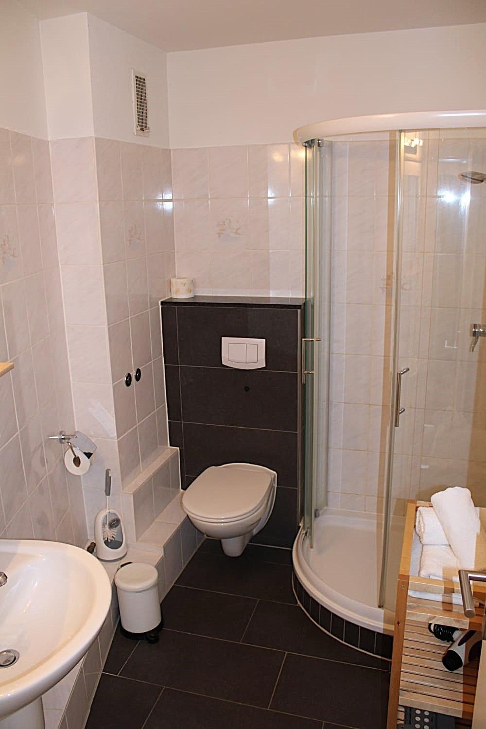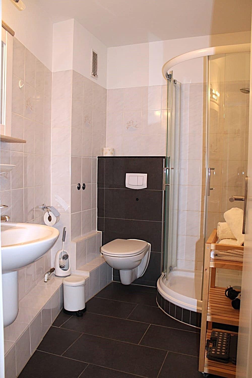 Im Badezimmer befindet sich eine Dusche und unter anderem ein Haartrockner.