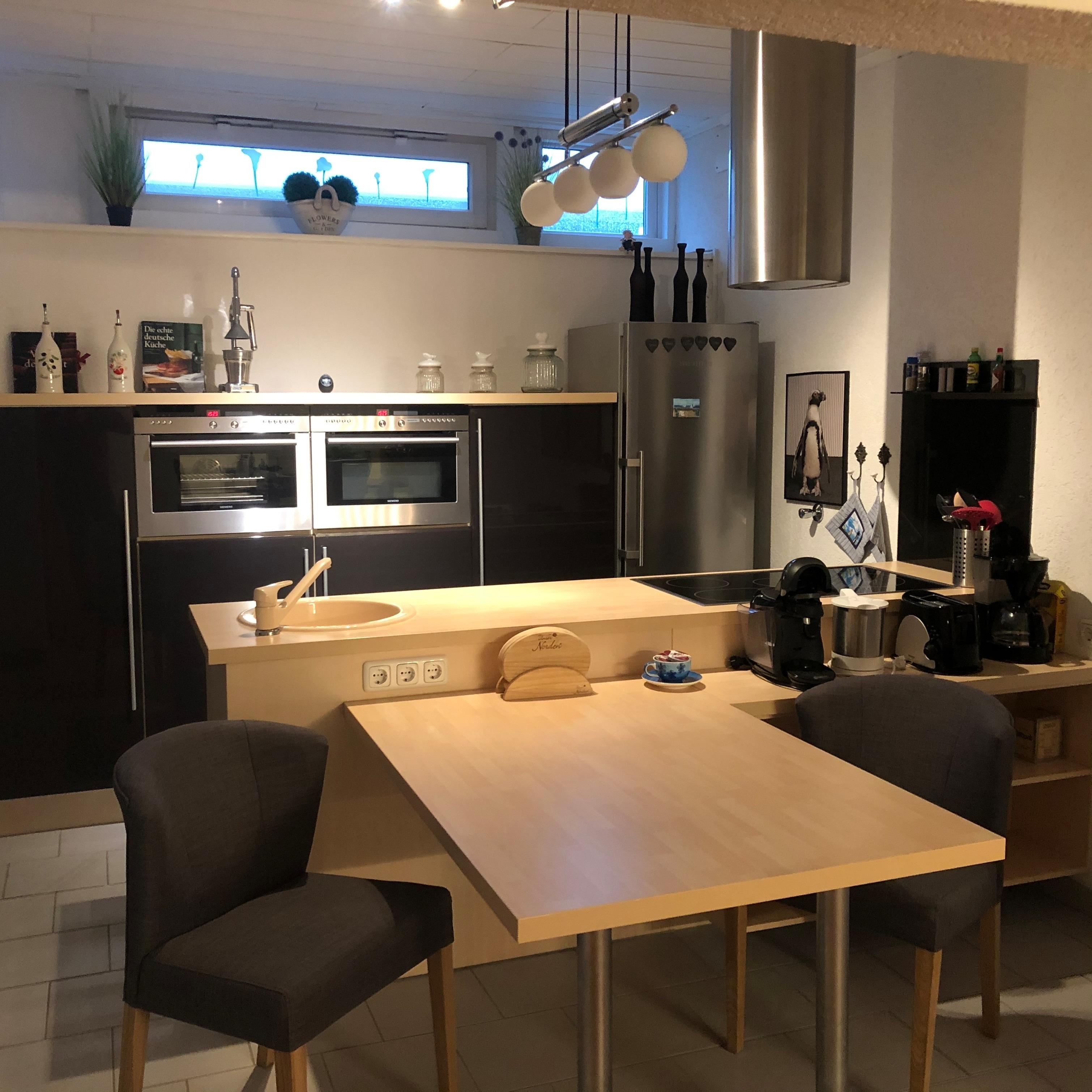 Die offene Küche ist mit Geschirrspülmaschine, 4er-Ceranfeld, Mikrowelle, Backofen sowie Kaffeemaschine, Wasserkocher und Kaffeeautomat versehen, ein kleiner zusätzlicher Esstisch befindet sich hier ebenfalls.