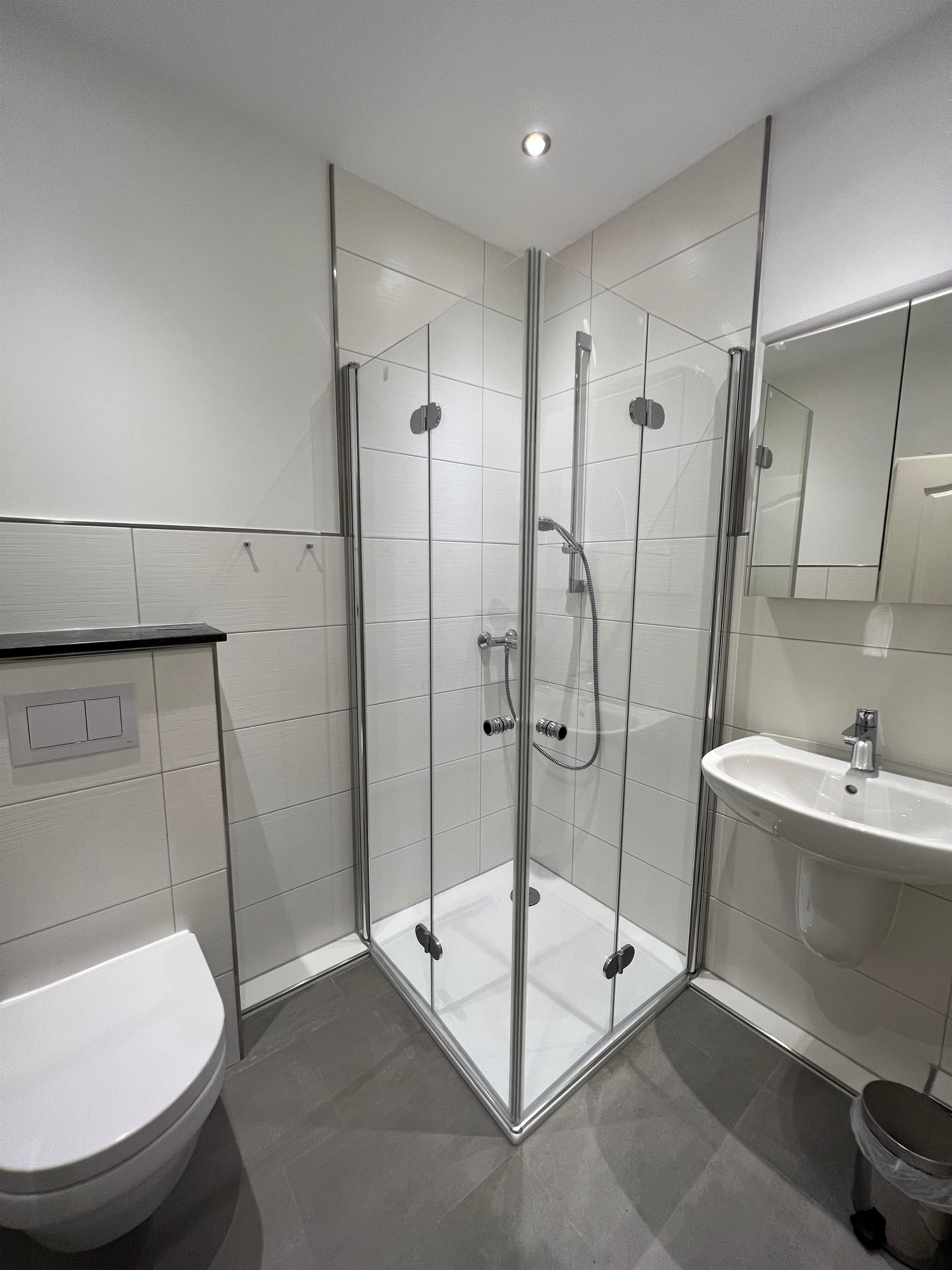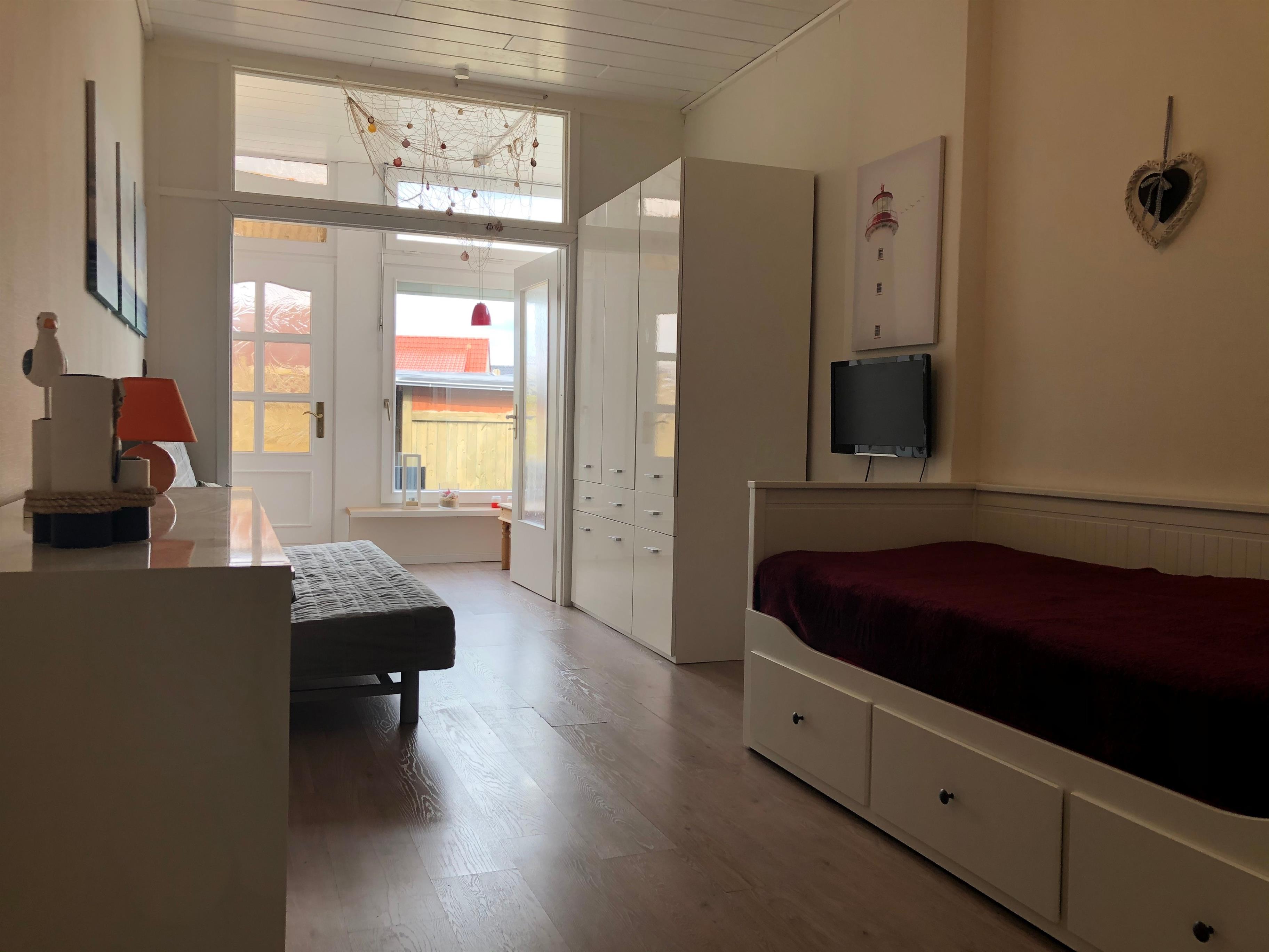 Das zweite kleinere Schlafzimmer verfügt über ein Bett von 1,60 x 2,00 m Größe sowie eine Schlafcouch von 1,40 x 2,00m und ist ebenfalls mit einem Kleiderschrank sowie einem zweiten TV und einer Kommode versehen. Das Badezimmer verfügt über Dusche/WC. Dieses wurde im Herbst 2022 komplett saniert.