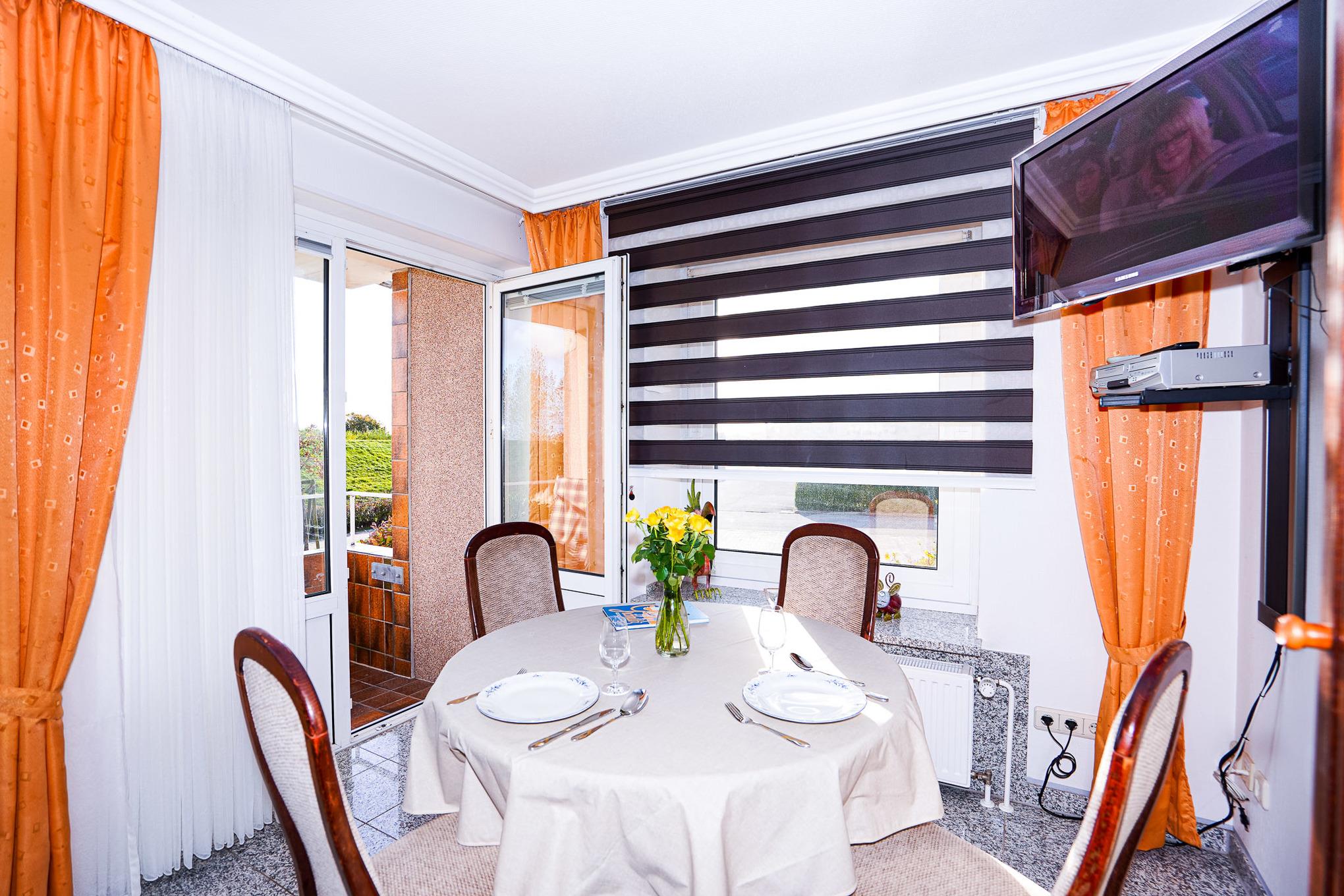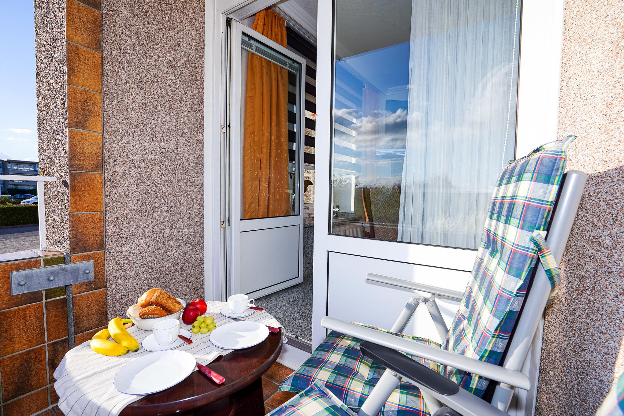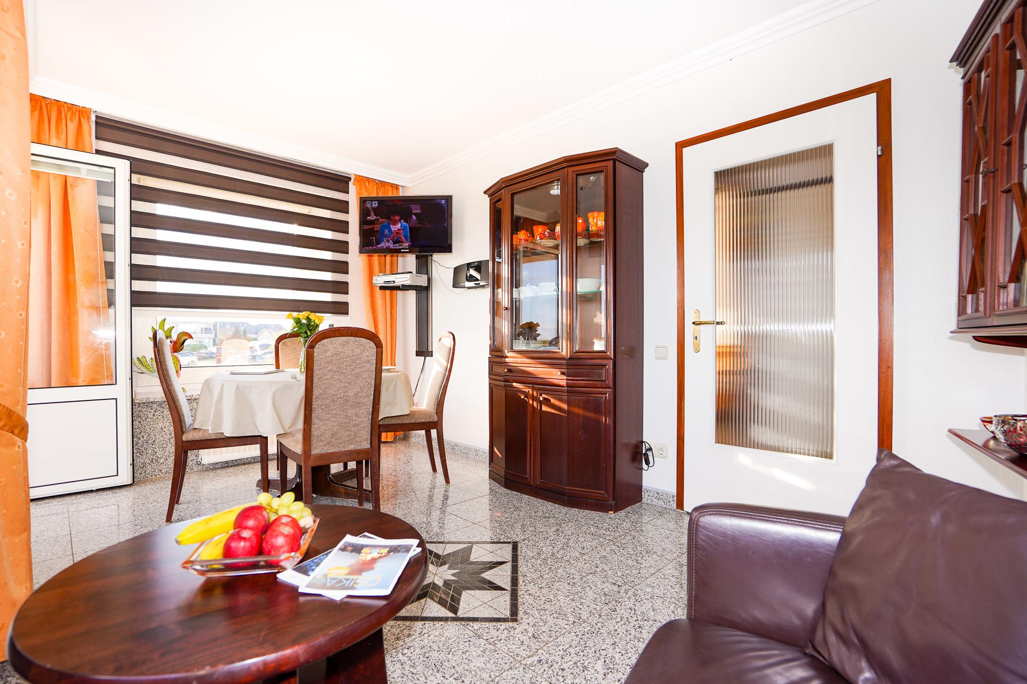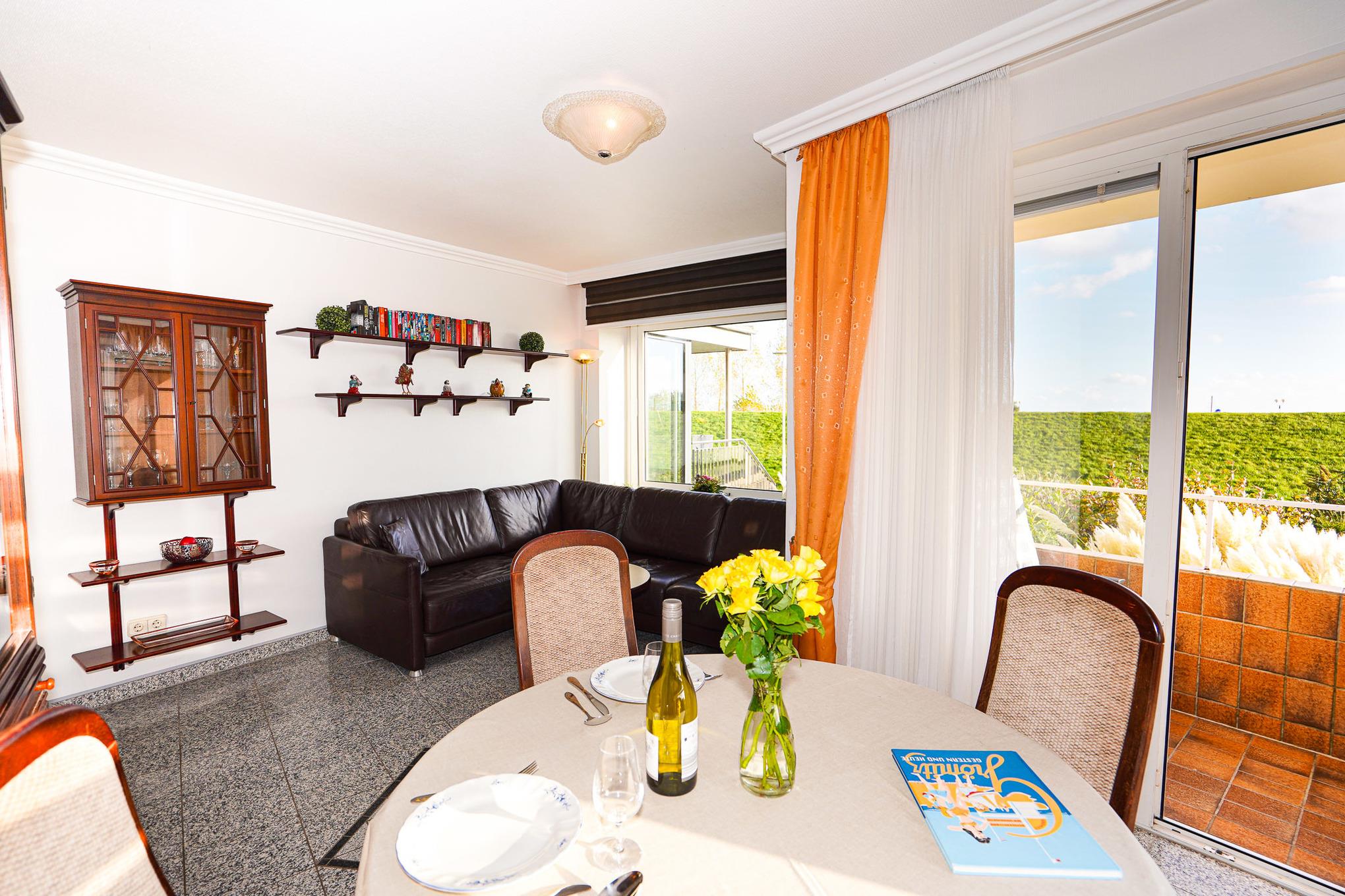 Das Wohnzimmer ist mit einem Granitboden ausgelegt und bietet Ihnen eine große Leder-Eckcouch, einen Esstisch und einen Fernseher, der zu entspannten Abenden einlädt. Erholen Sie sich nach einem aufregenden Urlaubstag auf dem Balkon mit Blick auf den Deich.