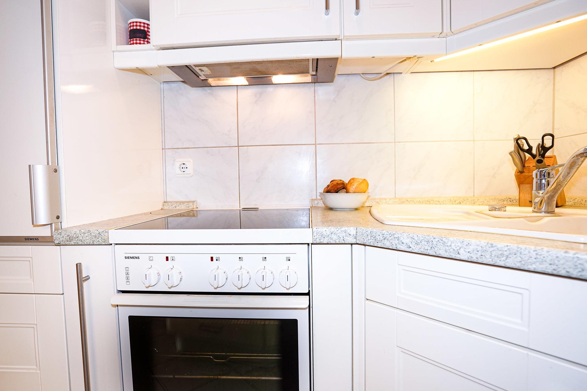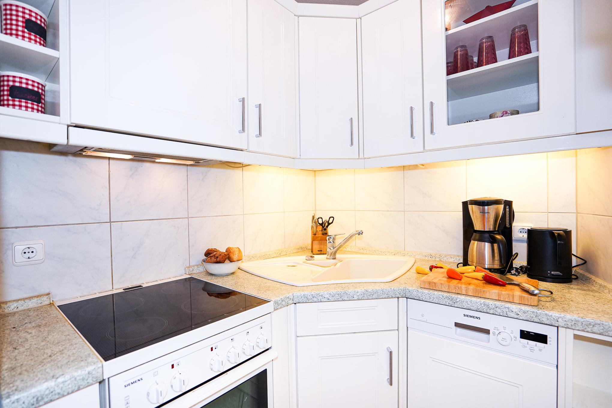 Die separate Küche ist voll ausgestattet und bietet unter anderem ein Cerankochfeld, Backofen, Kühlschrank mit Gefrierfach, Spülmaschine und weitere kleine Küchenhelfer wie Kaffeemaschine, Wasserkocher und Toaster.