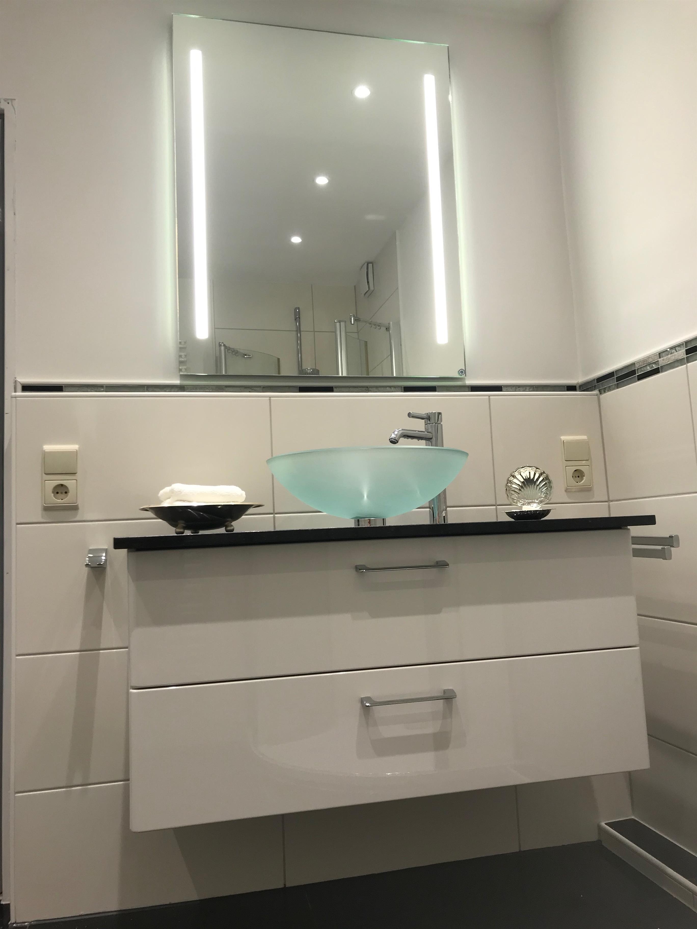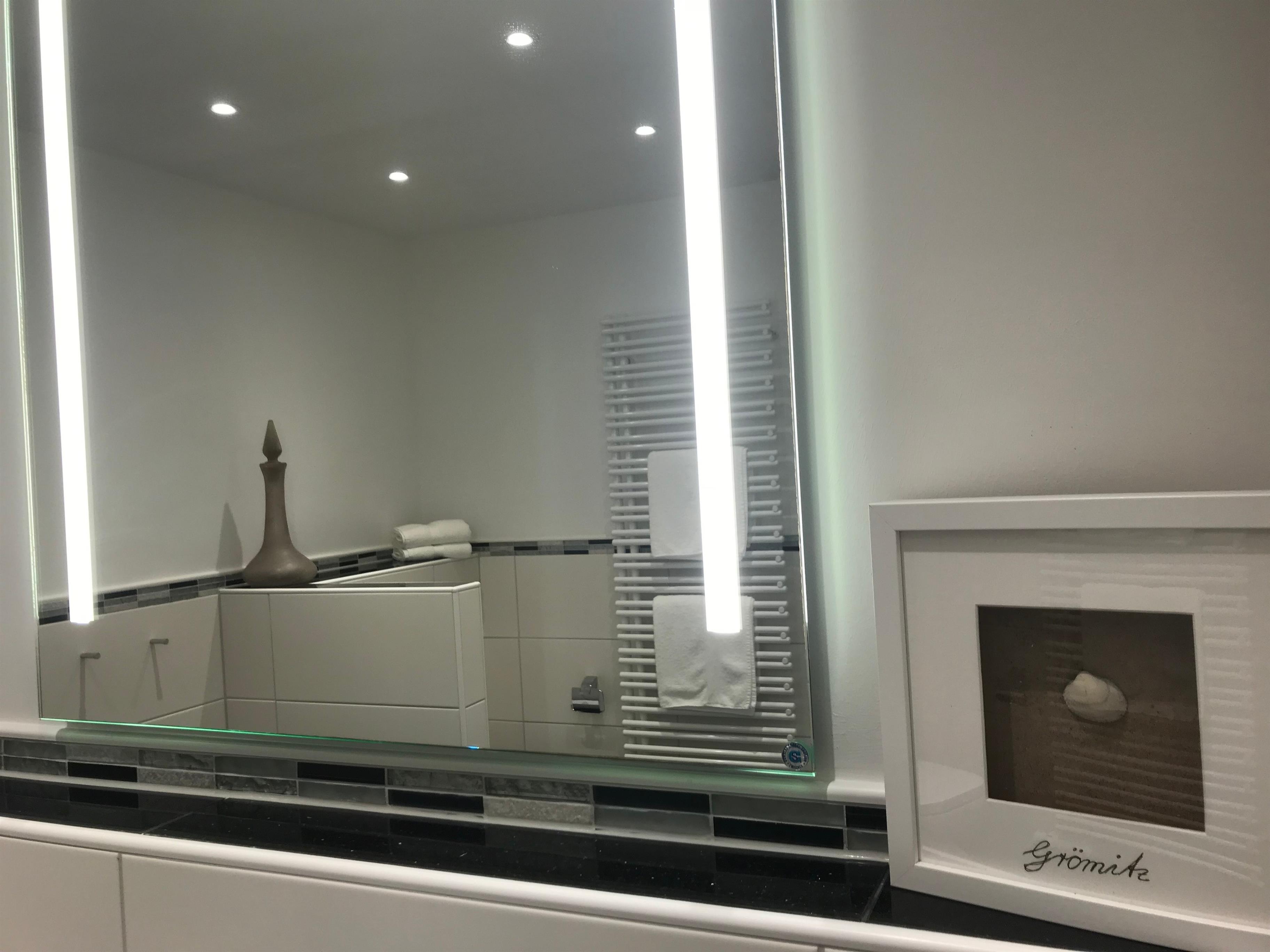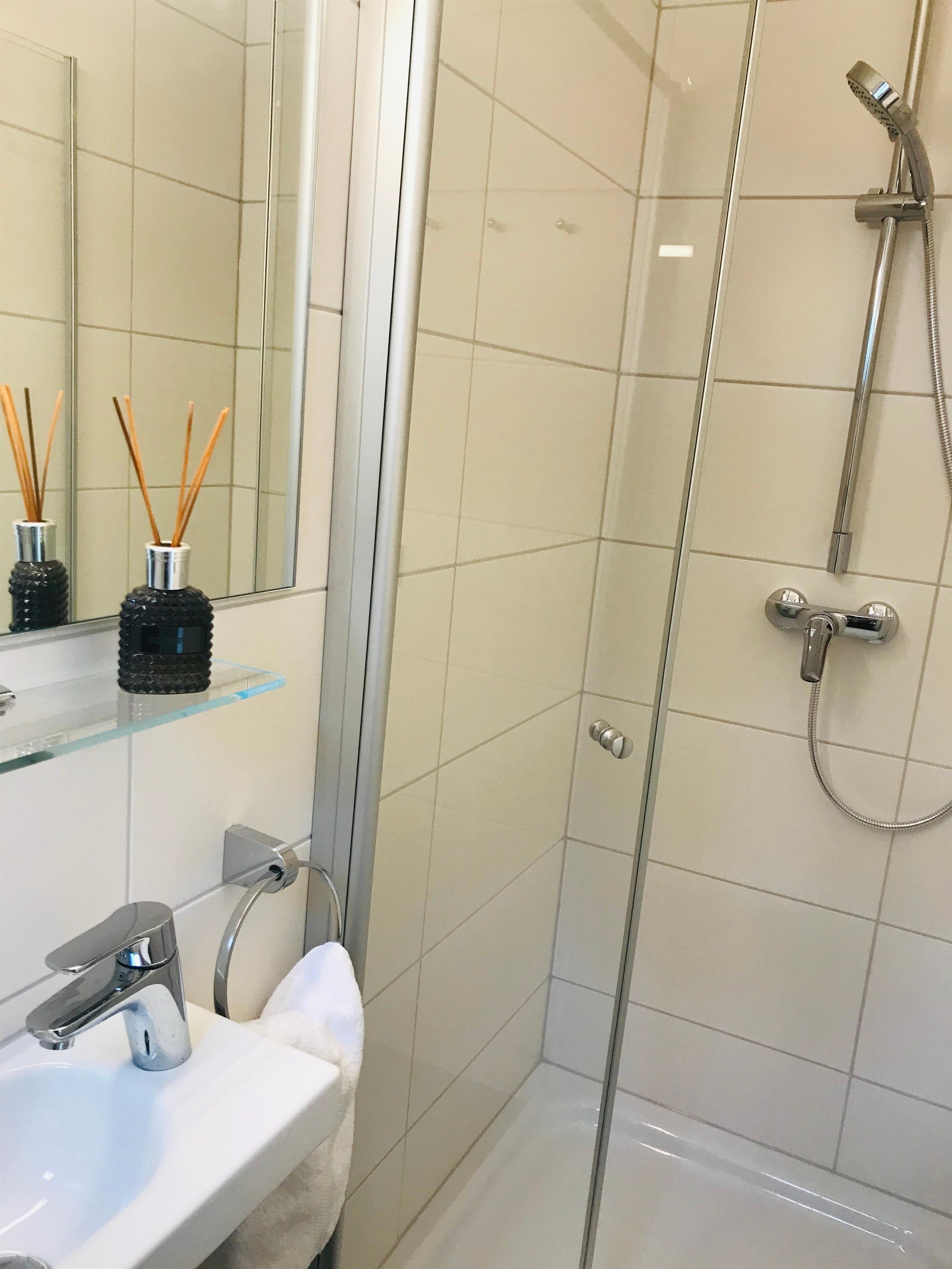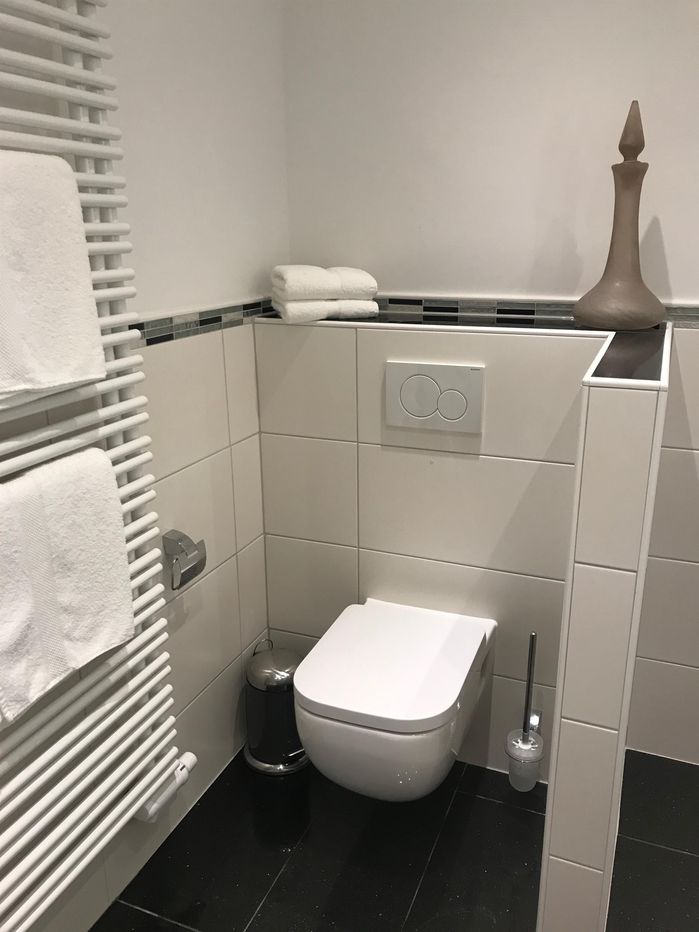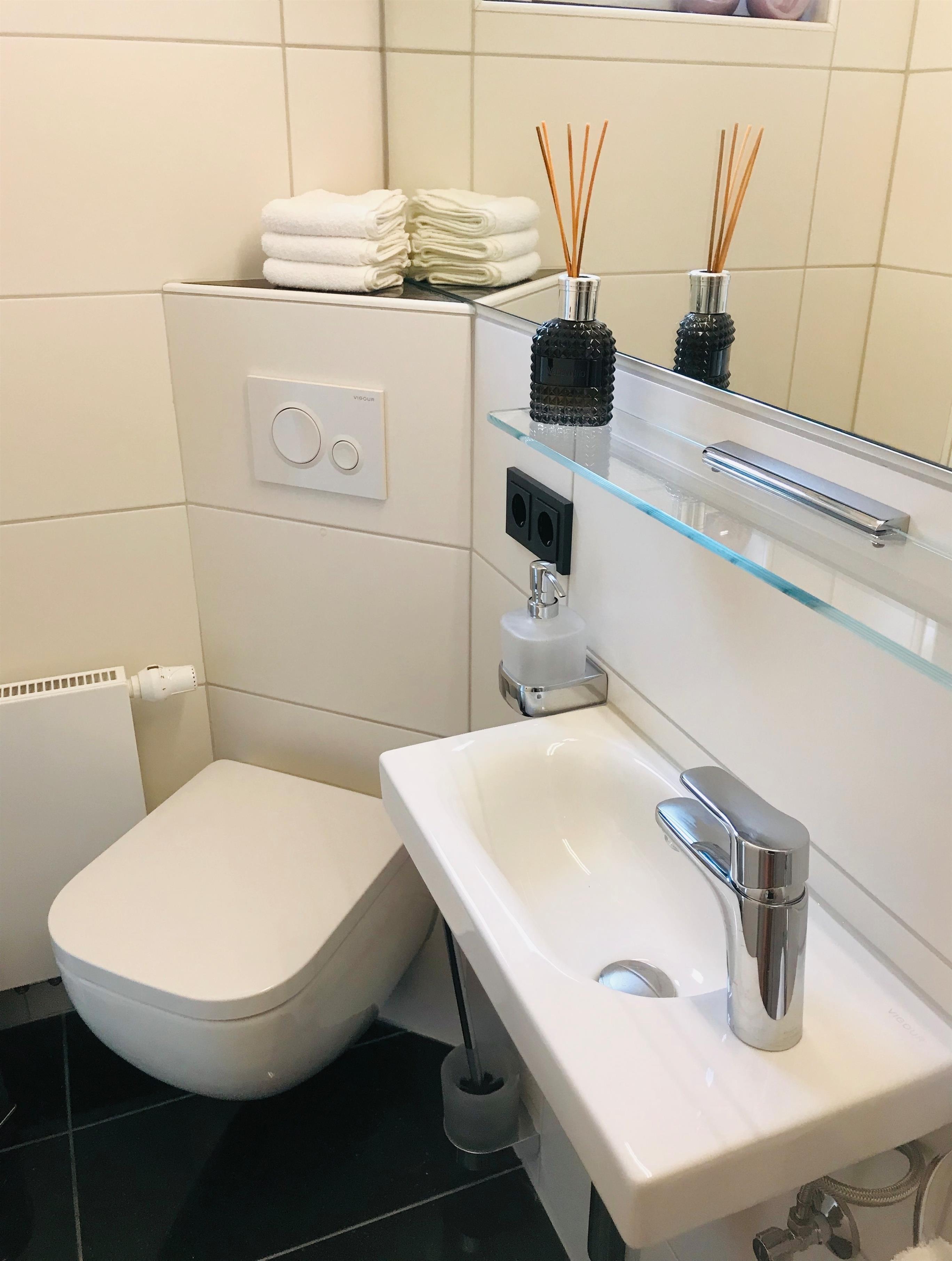Beide Badezimmer sind mit einem WC, einer Dusche und einer Handtuchheizung ausgestattet.