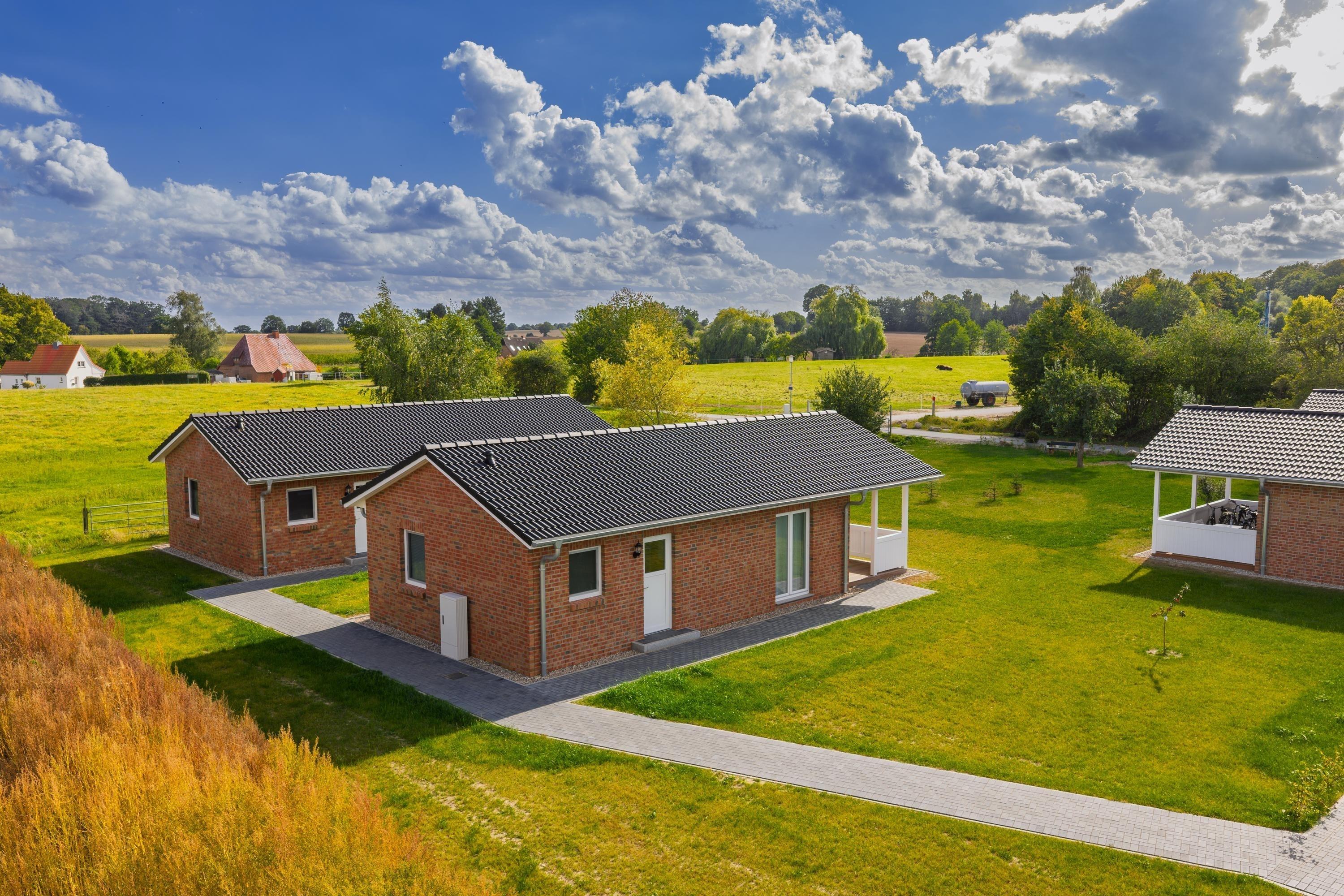 Nahe Grömitz befindet sich der idyllisch gelegene Hof Hagen weit ab von Trubel und Straßenlärm. Hier befinden sich die in 2025 neu errichteten Ferienhäuser. Sie bieten 51 m² ebenerdige Wohnfläche und verfügen über 2 Schlafzimmer, einen Wohn- und Essbereich mit Küche und ein Badezimmer mit Dusche. Die Ferienhäuser stehen einzeln und haben eine überdachte Terrasse.
